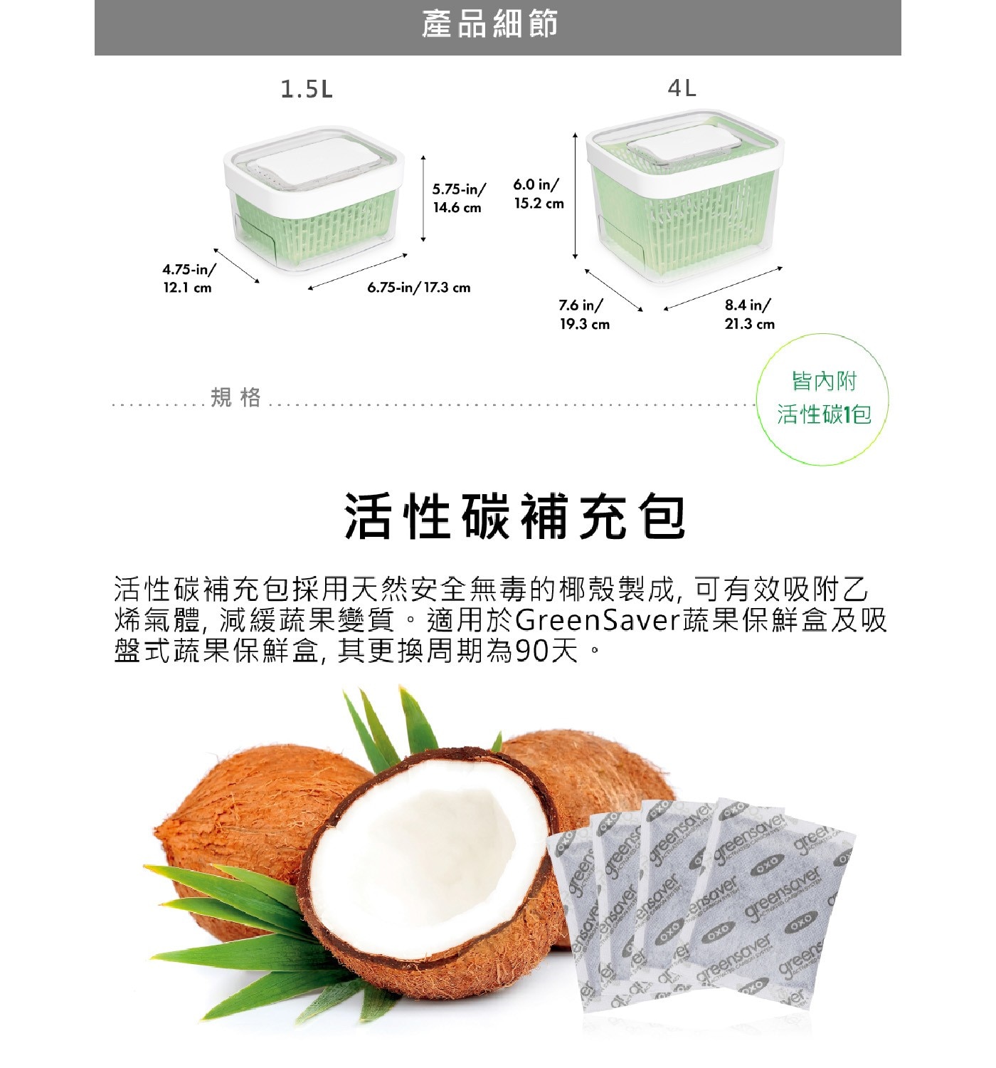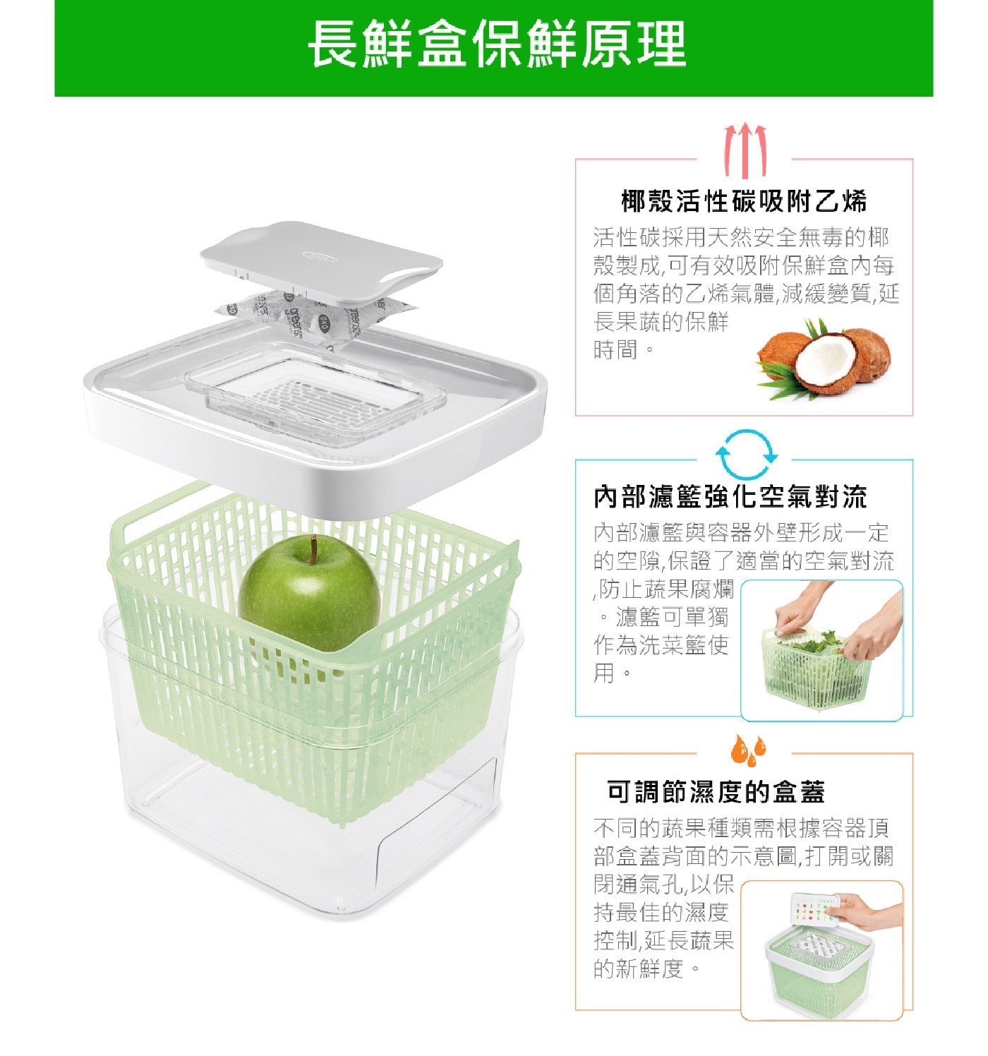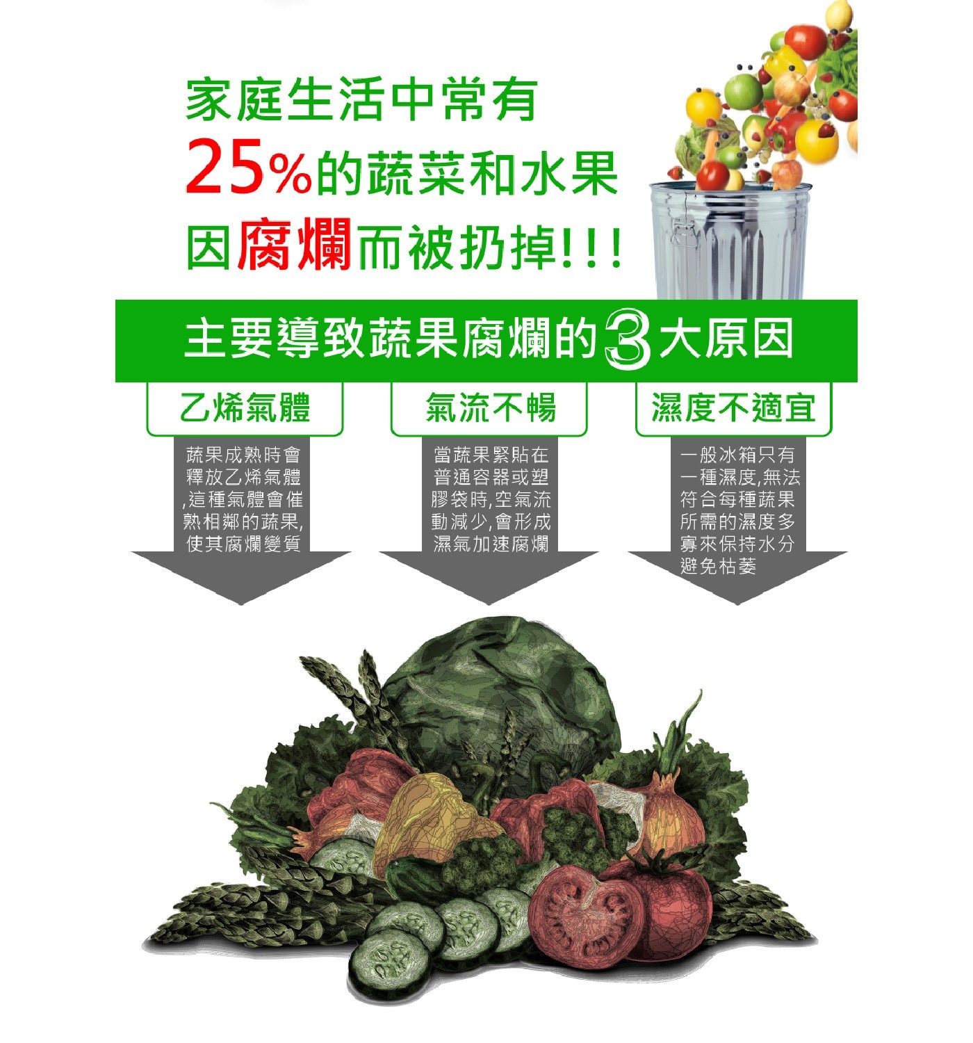 | 使用方式 | 1. 活性碳能吸附蔬果釋放的乙烯氣體(催熟素),減少蔬果老化速度,達到延長保鮮期。 2. 將天然椰殼活性碳包拆封後放置專用槽中,可吸收蔬果散發之乙烯,並透過可調節排氣口,為不同種類的產品保持最佳的濕度水平,延長蔬果新鮮度。 |