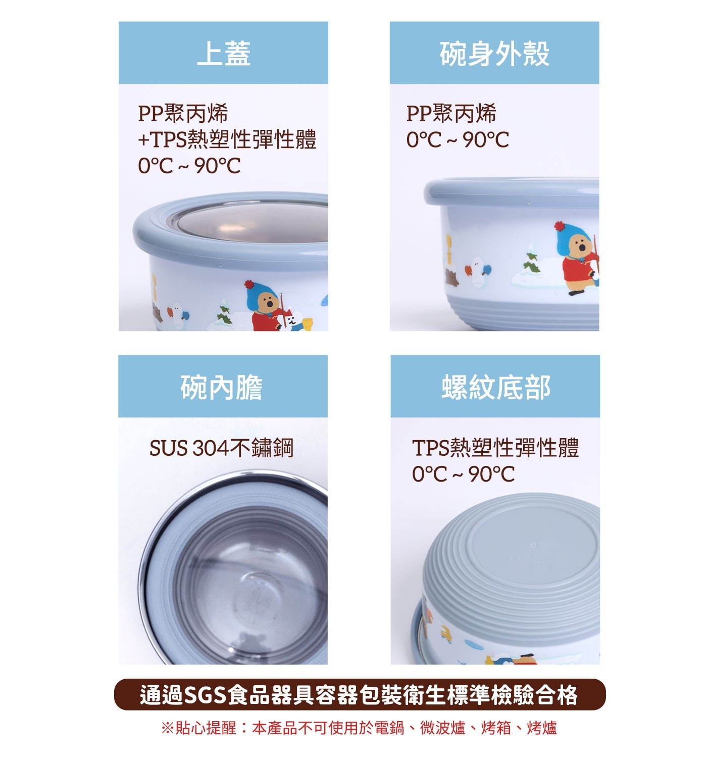 | 材質成分 | 碗內膽 - 304鏽鋼 碗身外殼 - PP 聚丙烯 (耐熱溫度90度C) 碗底部 - TPS (耐熱溫度90度C) 上蓋 - PP 聚丙烯+TPS (耐熱溫度90度C) |
