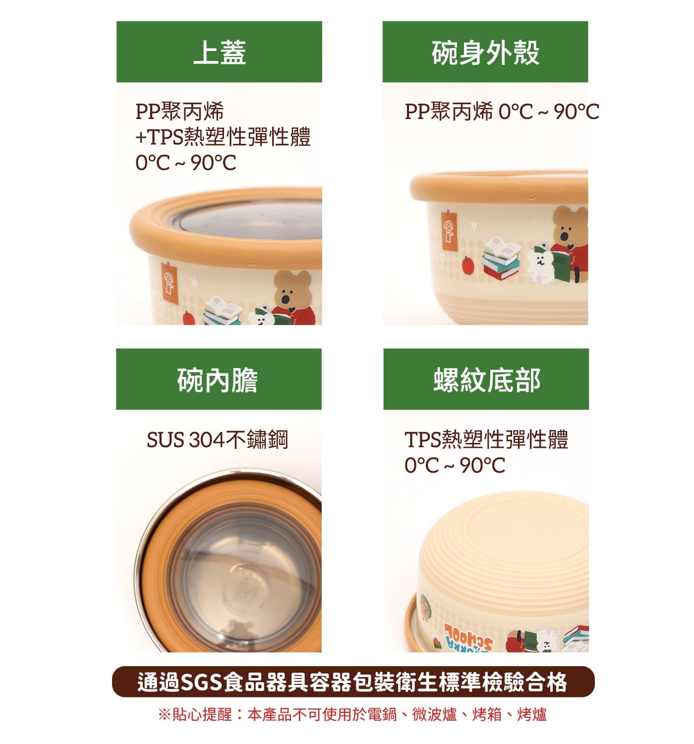 | 材質成分 | 碗內膽 - 304鏽鋼 碗身外殼 - PP 聚丙烯 (耐熱溫度90度C) 碗底部 - TPS (耐熱溫度90度C) 上蓋 - PP 聚丙烯+TPS (耐熱溫度90度C) 湯匙、叉子、筷子 - 316不鏽鋼 收納盒 - ABS |