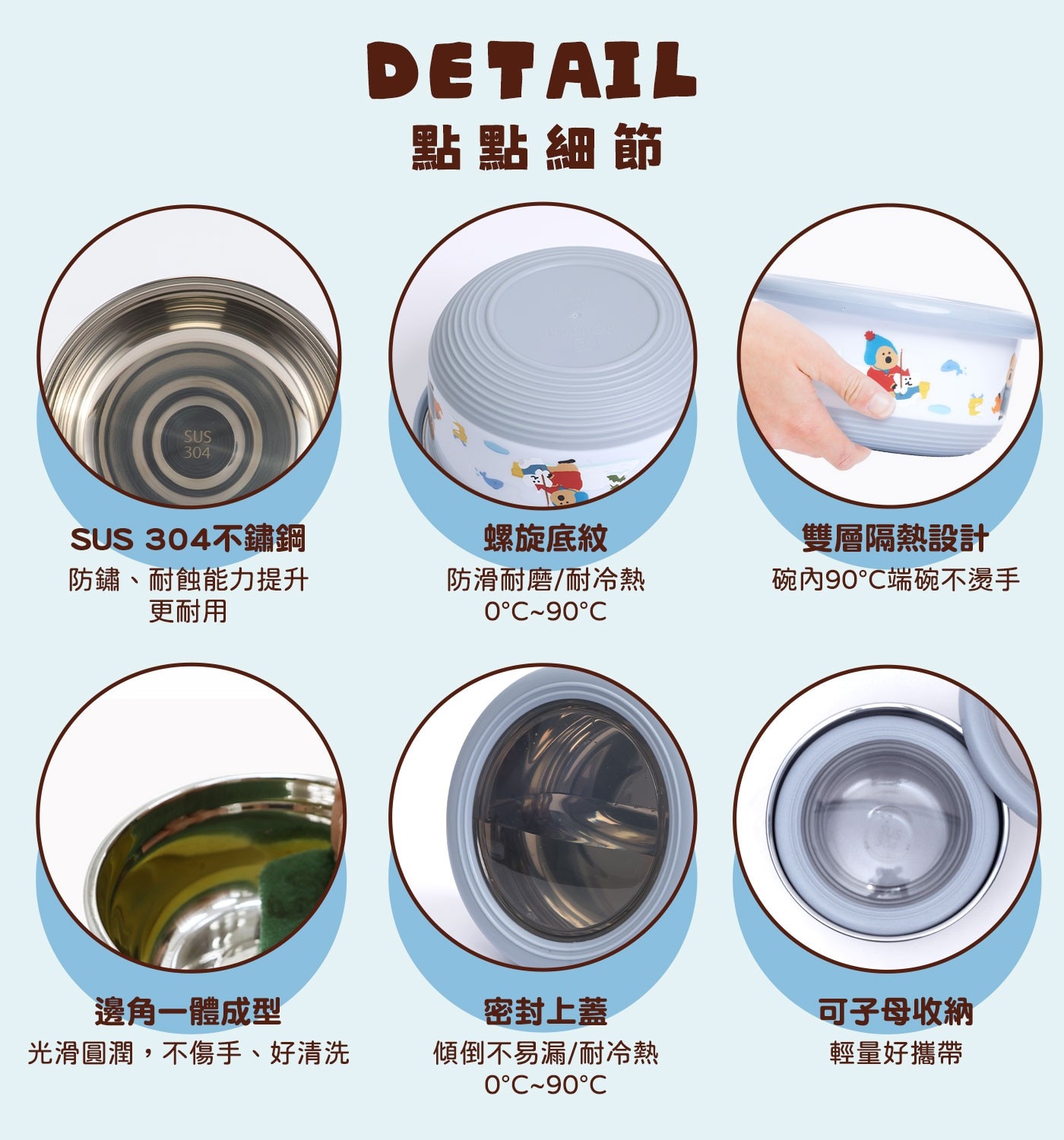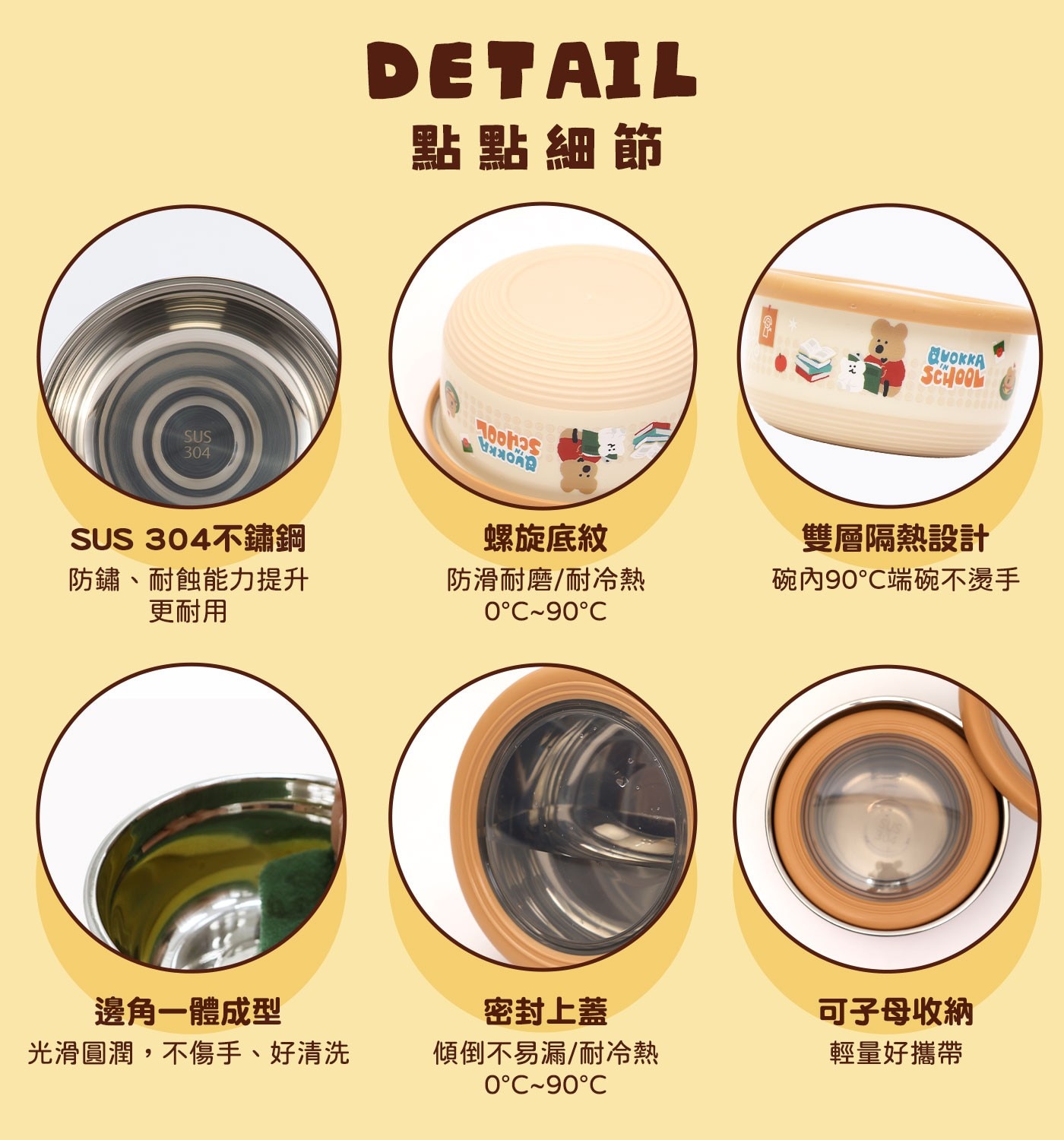 | 品名 | DINOTAENG 呆萌町 304不鏽鋼雙層隔熱碗 + 316不鏽鋼餐具 X 7件組 |