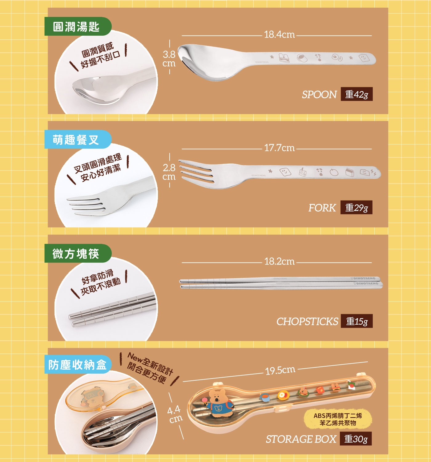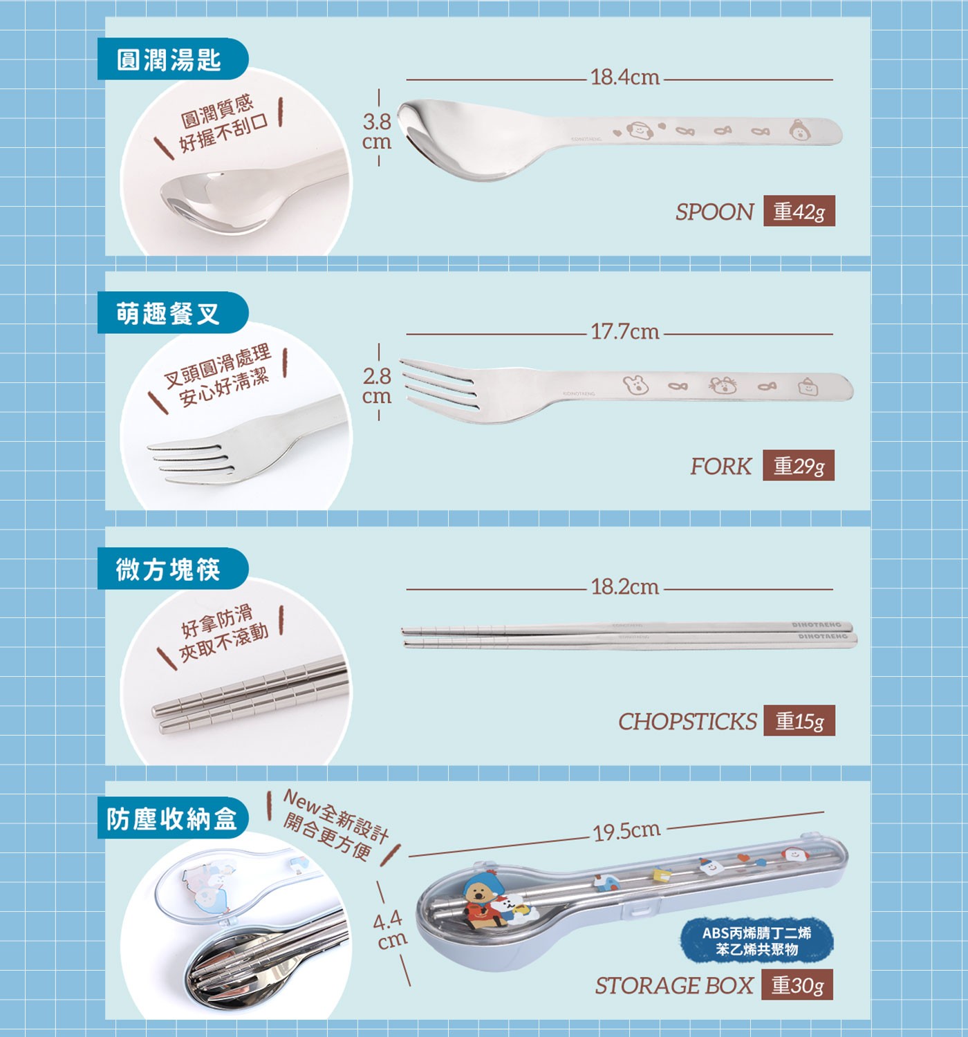 | 內容量/入數 | 420 毫升不鏽鋼碗 X 1入 730 毫升不鏽鋼碗 X 2入 不鏽鋼湯匙 X 1入 不鏽鋼叉子 X 1入 不鏽鋼筷子 X 1入 餐具收納盒 X 1入 |