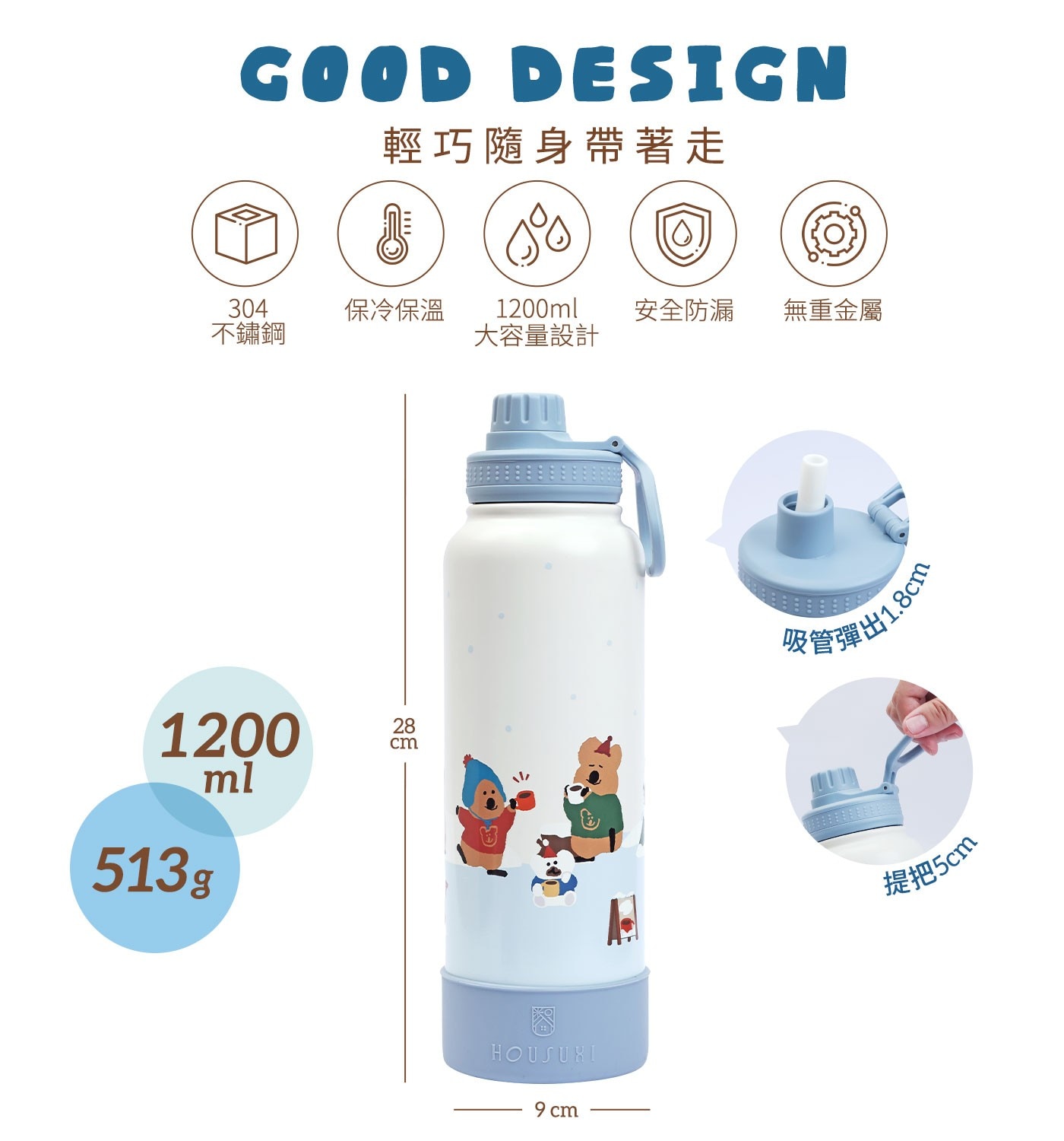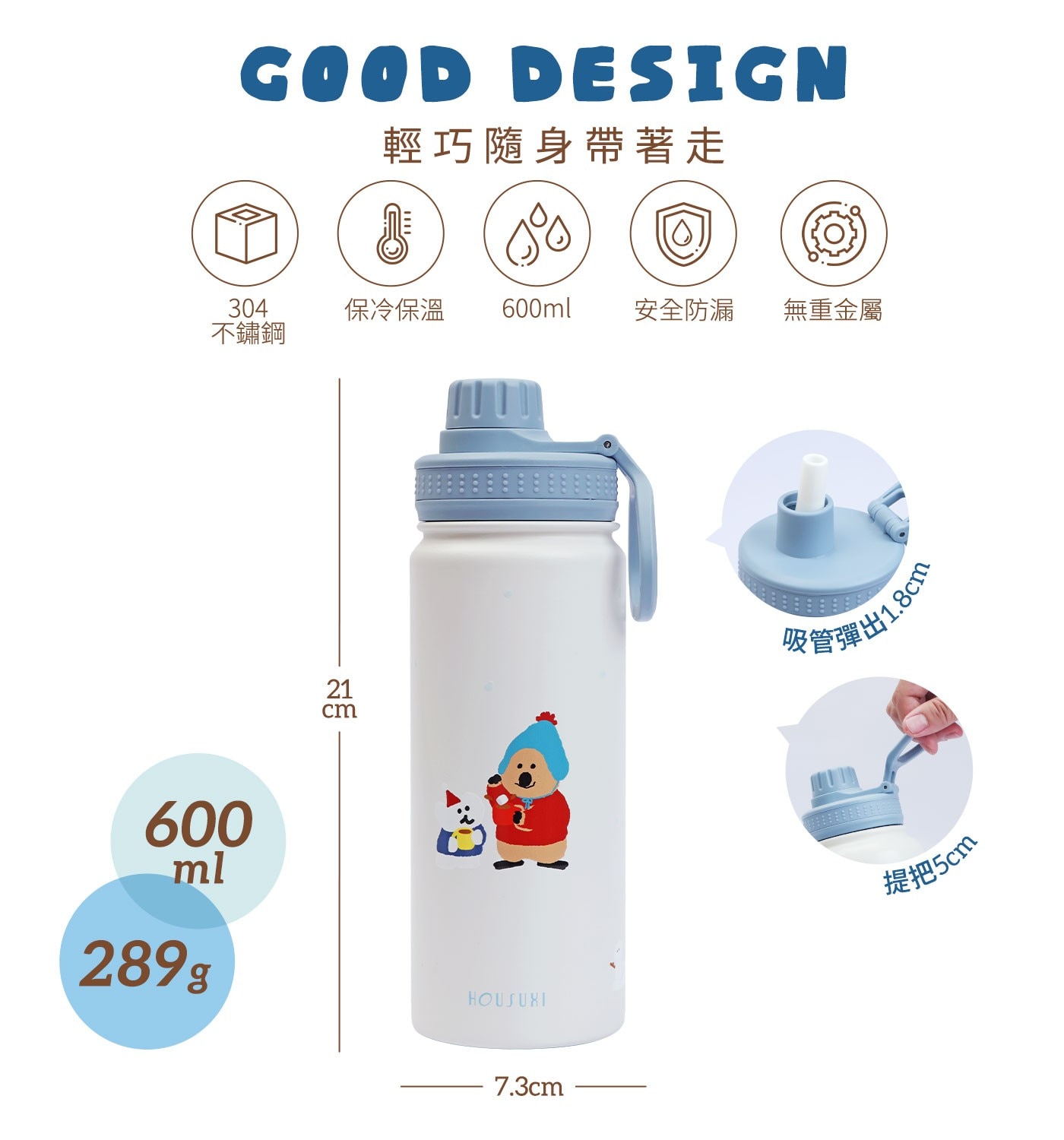 | 材質成分 | 瓶身 - 304不鏽鋼 上蓋、吸管 - PP 聚丙烯 (耐熱溫度100度C) + 矽膠 (耐熱溫度230度C) 墊圈、止滑套 - 矽膠 (耐熱溫度230度C) |