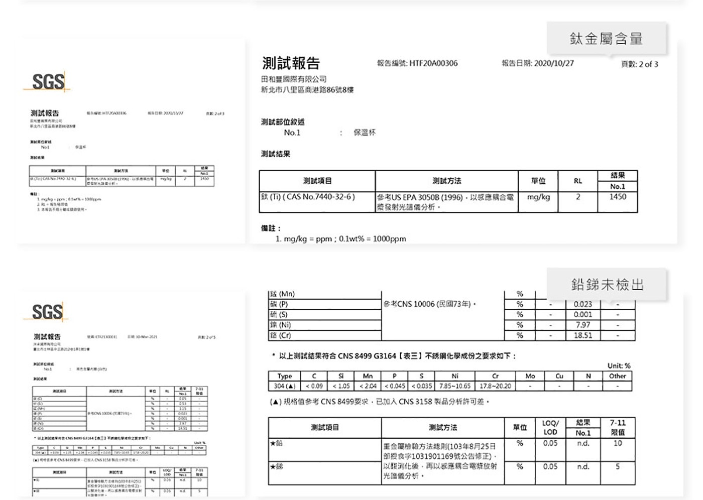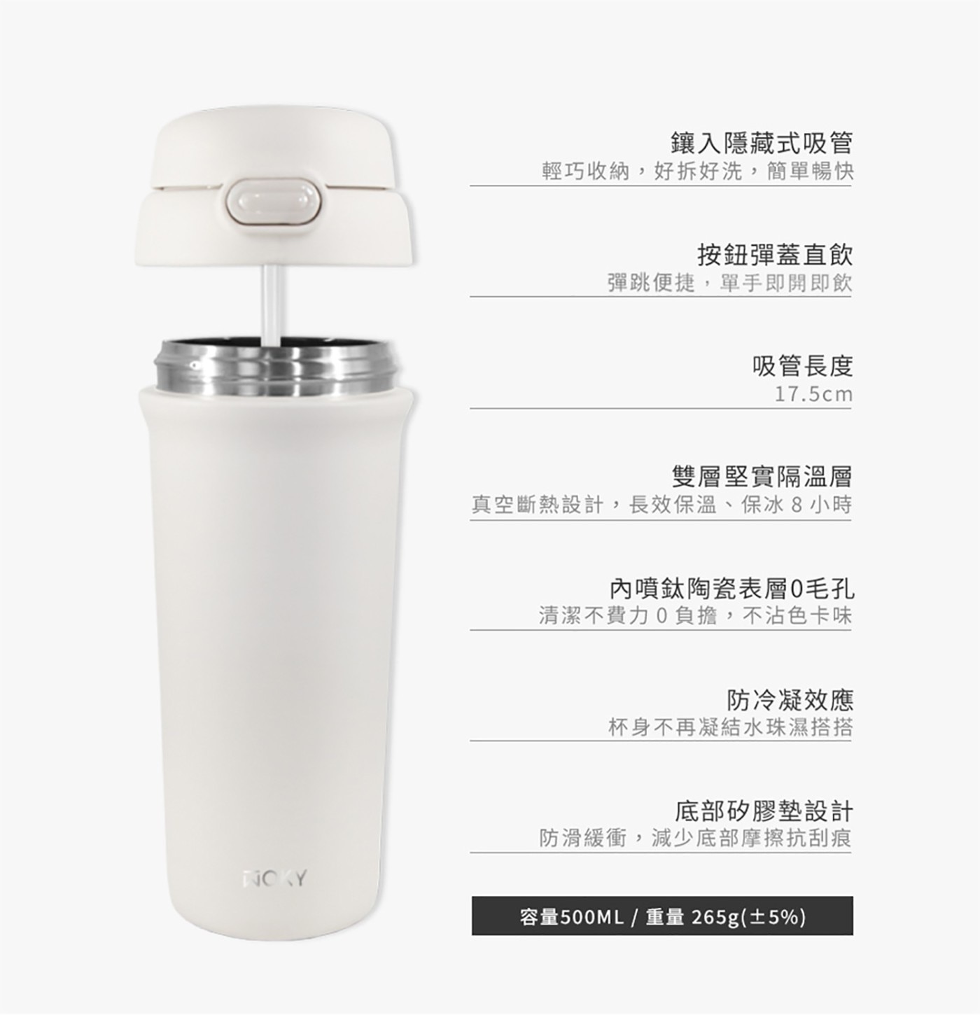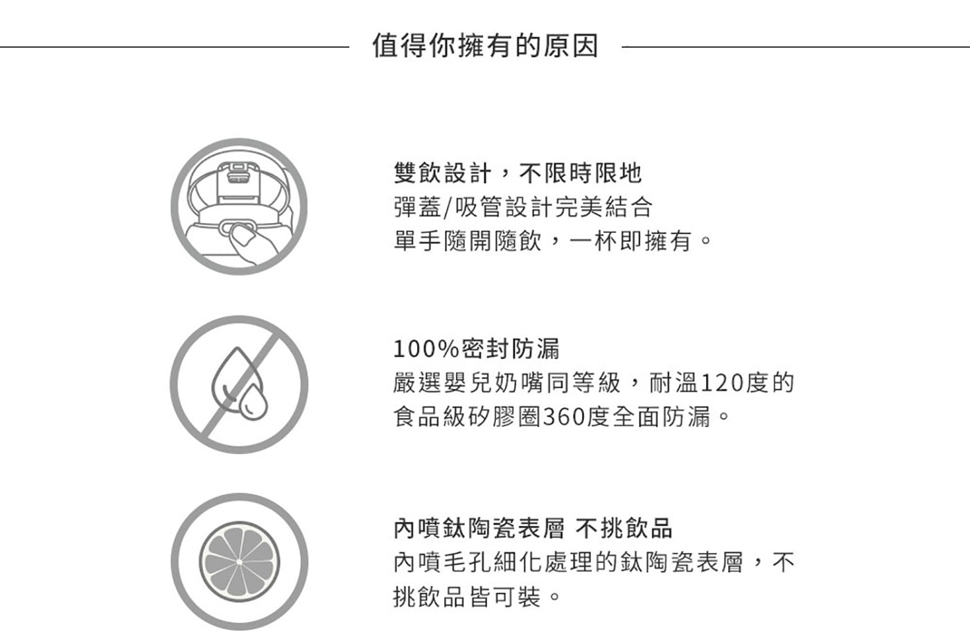 | 材質成分 | 內膽: 304不鏽鋼+鈦陶瓷塗層 外層: 304不鏽鋼 上蓋: PP+矽膠 吸管、密封圈: 矽膠 矽膠耐熱溫度: 190度C PP耐熱溫度: 100度C |