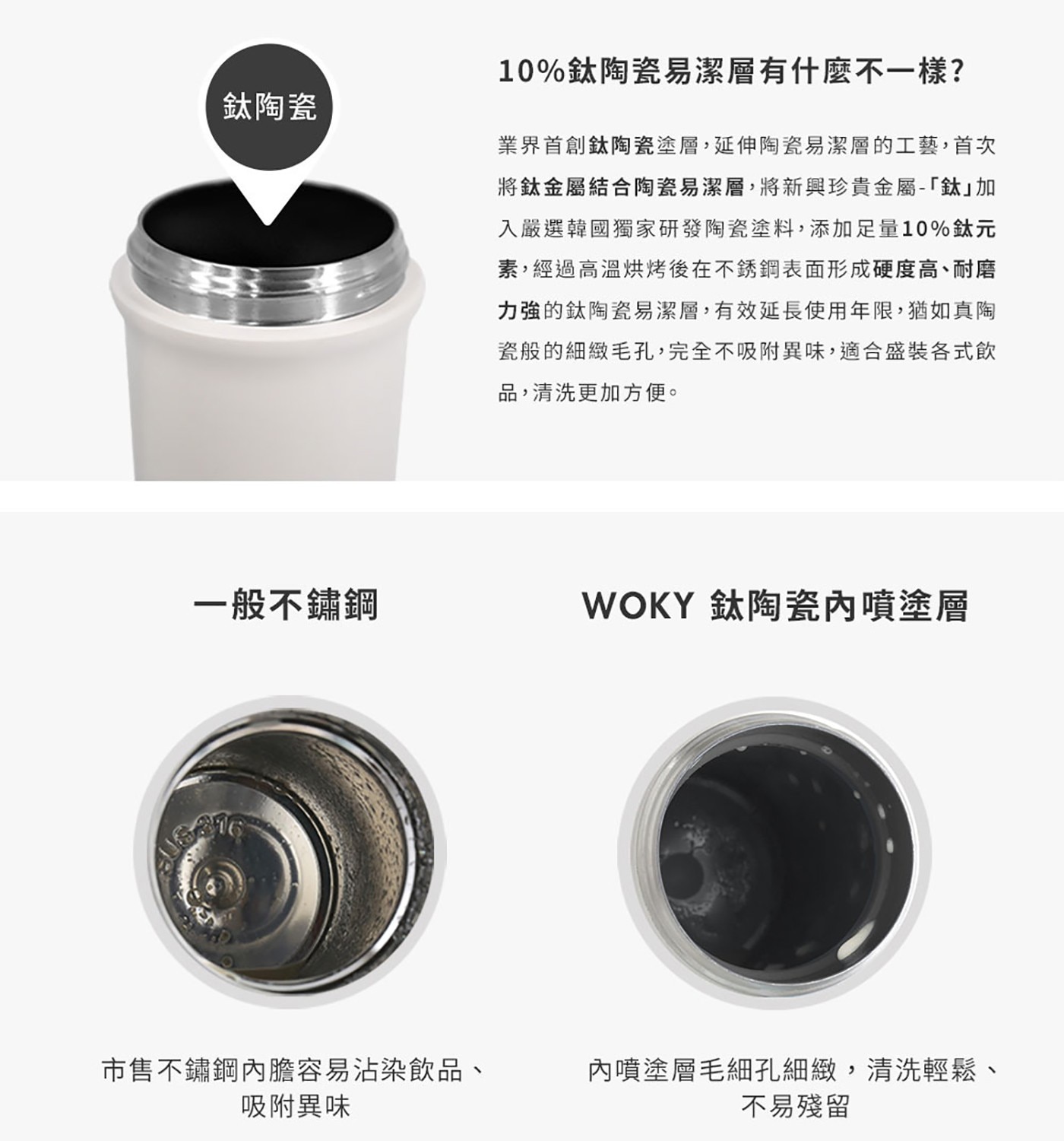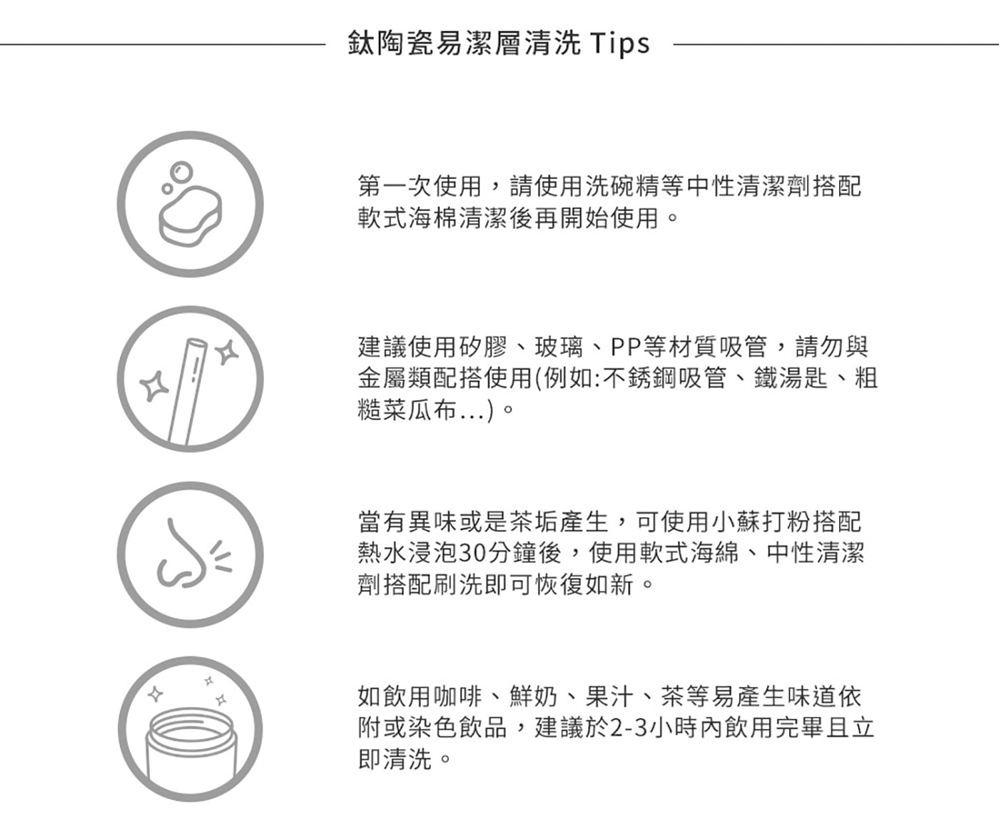- 10%鈦+陶瓷塗層,不沾色、不卡味,適合各式飲品