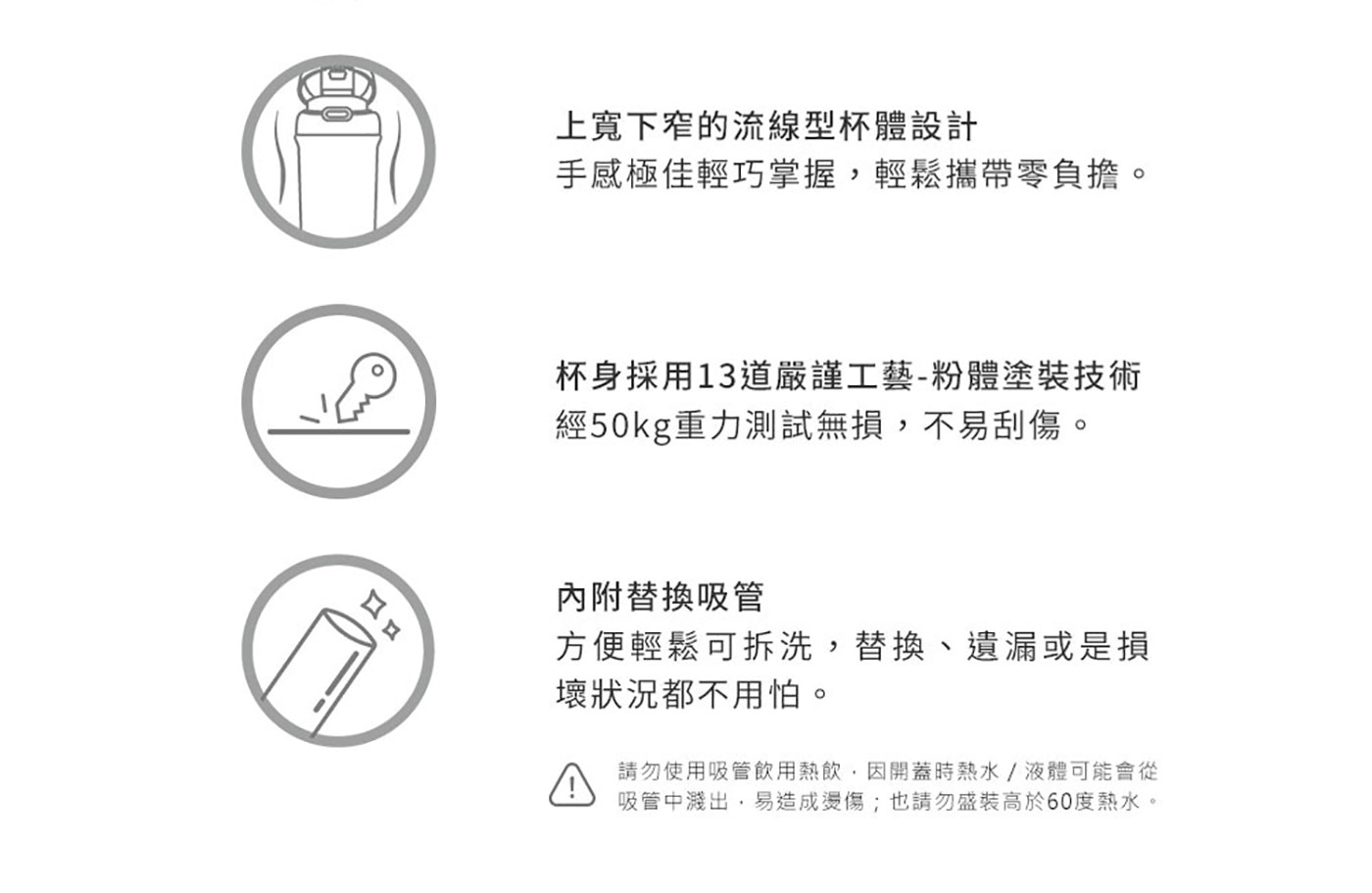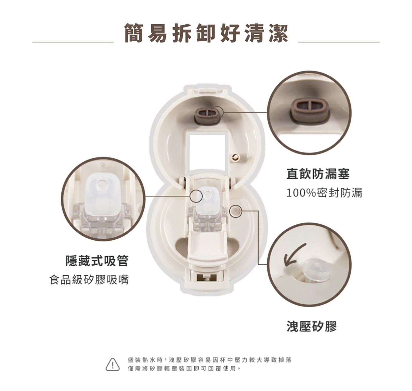 | 注意事項 | 請勿使用尖銳物品、鋼刷或菜瓜布等金屬類物品,避免造成易潔層損傷。 請勿使用洗碗機或烘碗機清洗。 不可水煮消毒避免杯蓋變形。 建議水溫70度以下,避免燙傷。 請勿傾倒入放包包,避免滲漏。 請勿重摔,避免商品損壞以及影響保溫效果。 供食品接觸用途。 供重複使用。 |