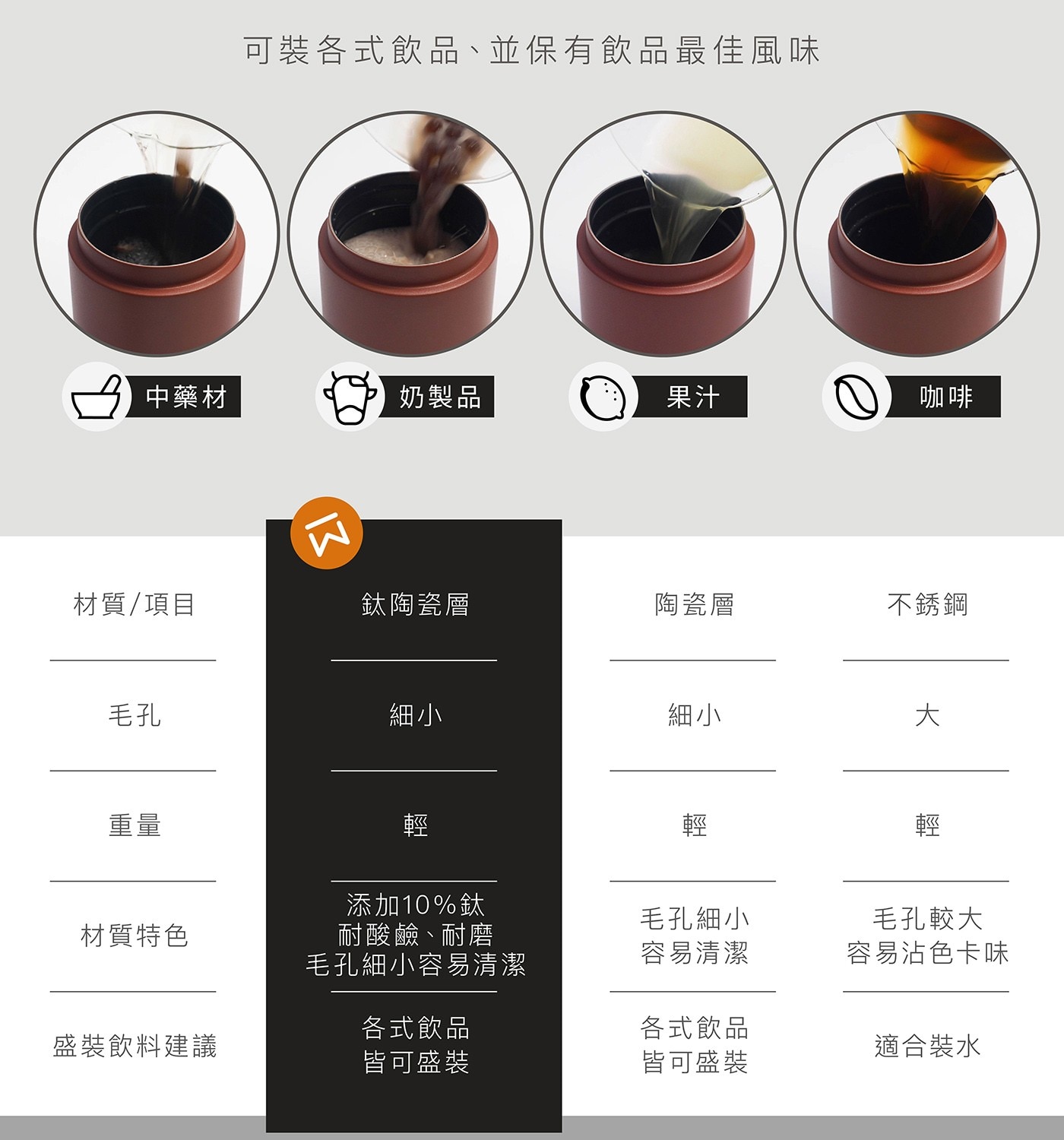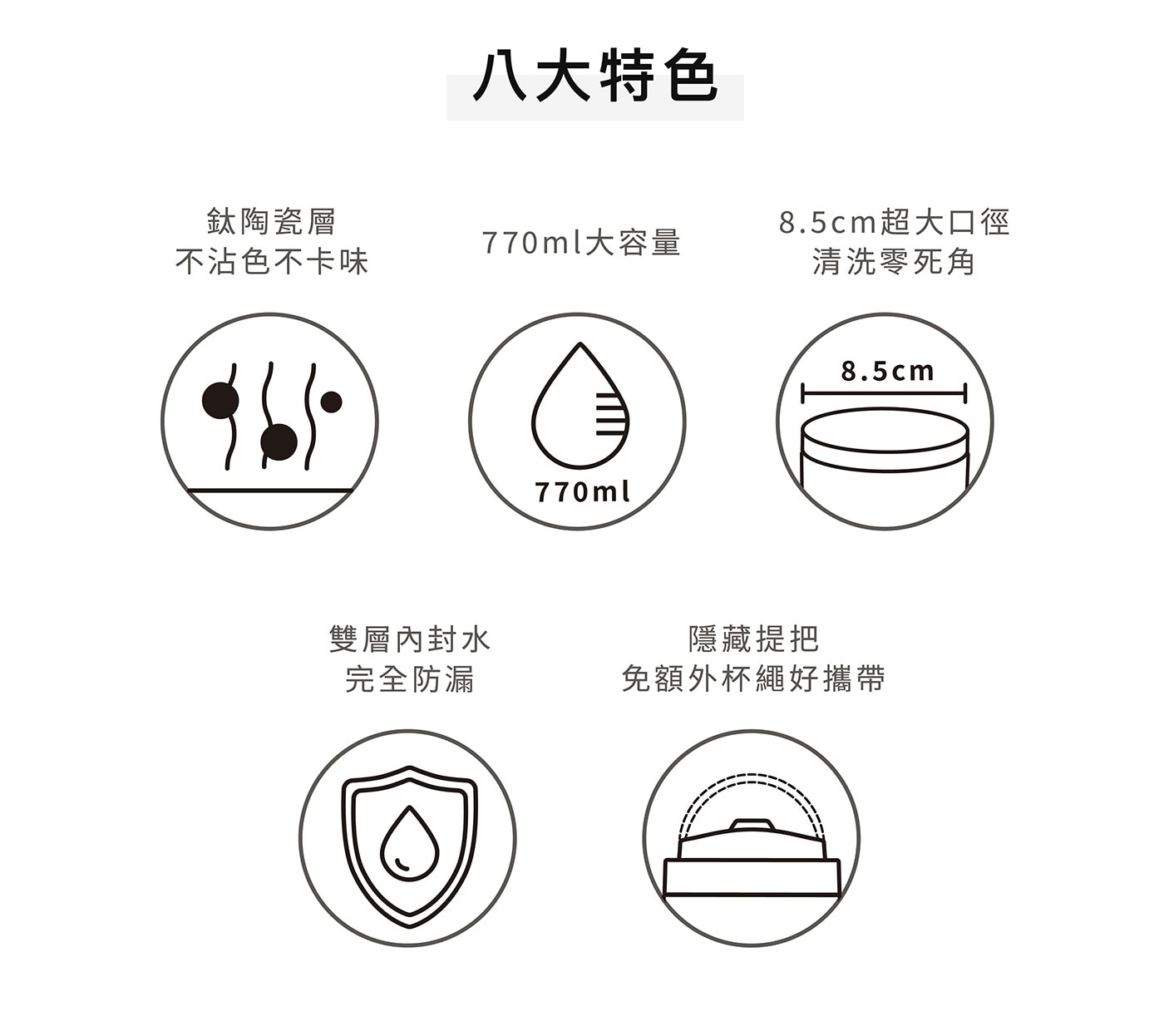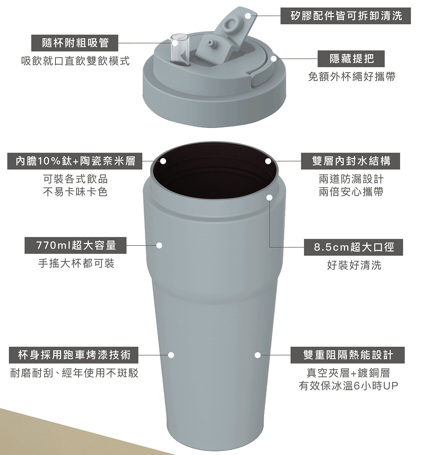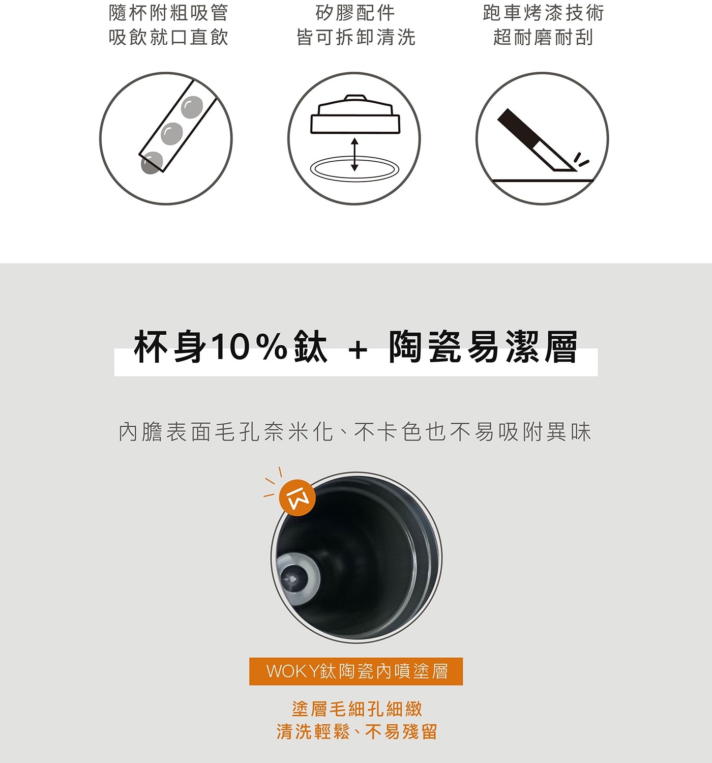 - 10%鈦+陶瓷塗層,不沾色、不卡味,適合各式飲品