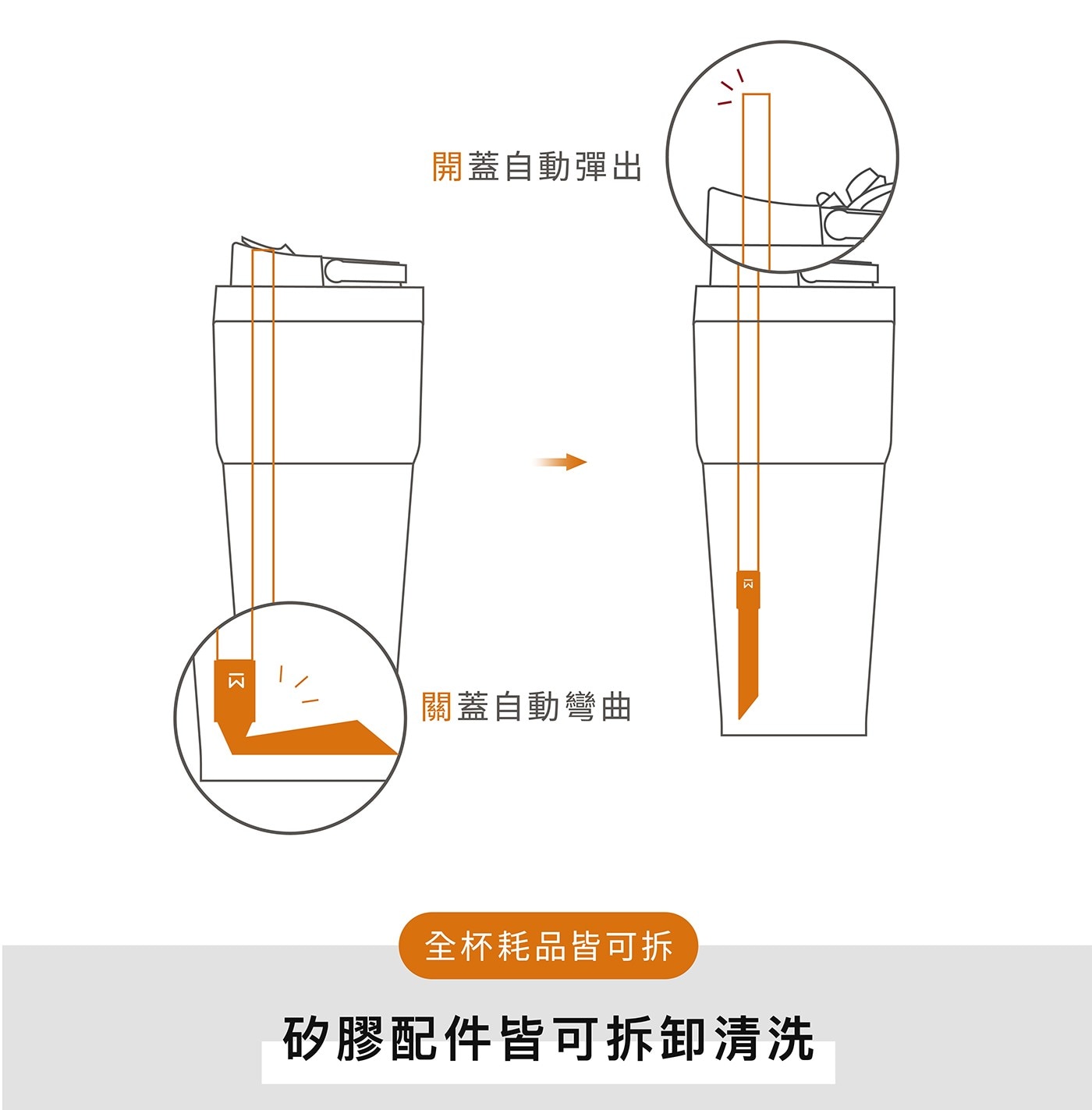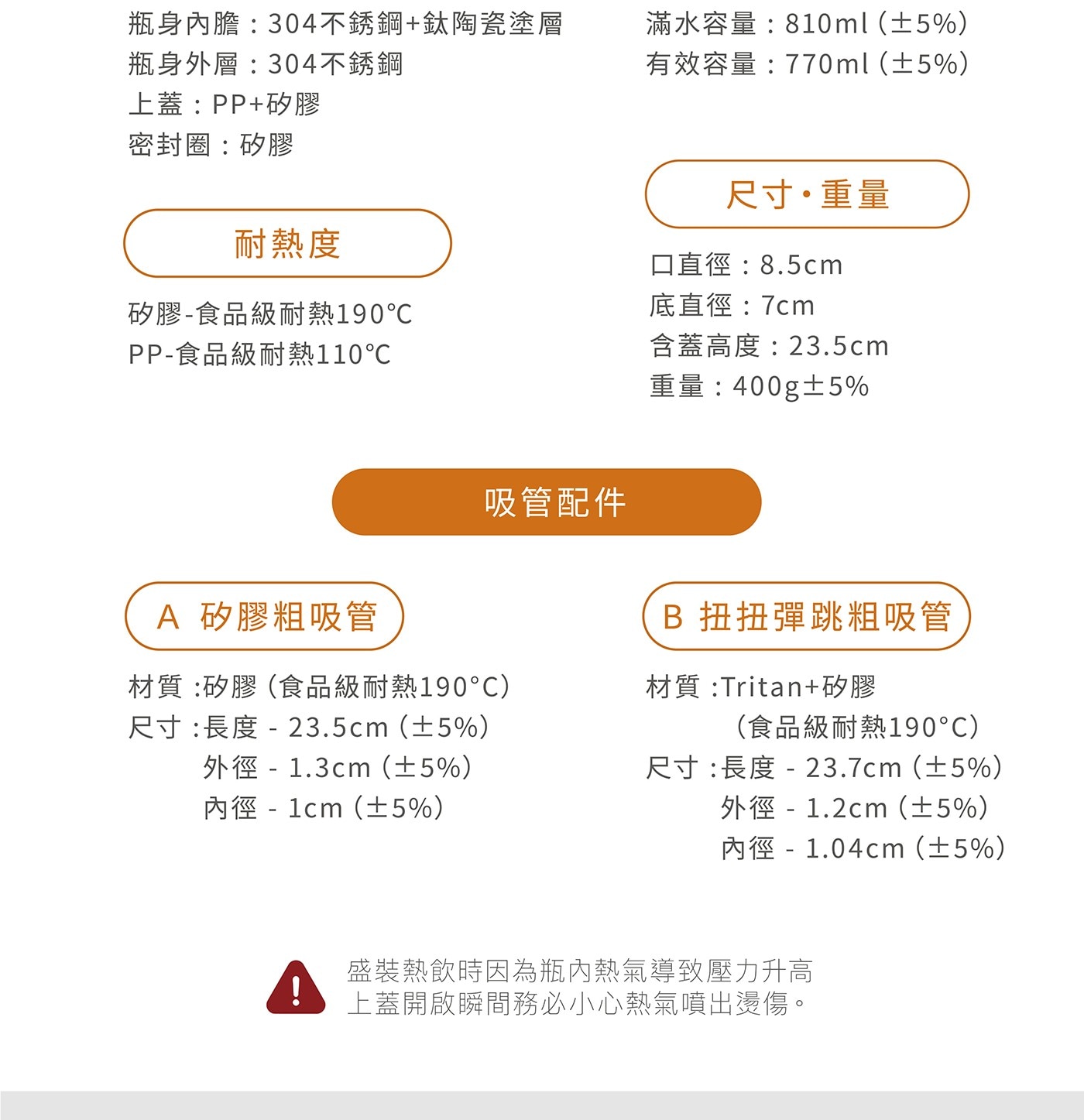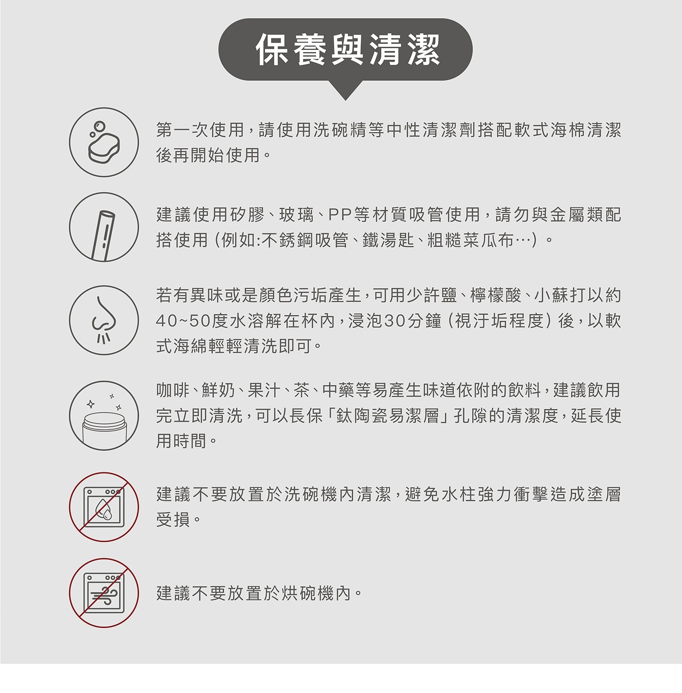| 注意事項 | 1. 請勿使用尖銳物品、鋼刷或菜瓜布等金屬類物品,避免造成易潔層損傷。 2. 請勿使用洗碗機或烘碗機清洗。 3. 不可水煮消毒避免杯蓋變形。 4. 建議水溫70度以下,避免燙傷。 5. 請勿傾倒入放包包,避免滲漏。 6. 請勿重摔,避免商品損壞以及影響保溫效果。 7. 供食品接觸用途。 8. 供重複使用。 |