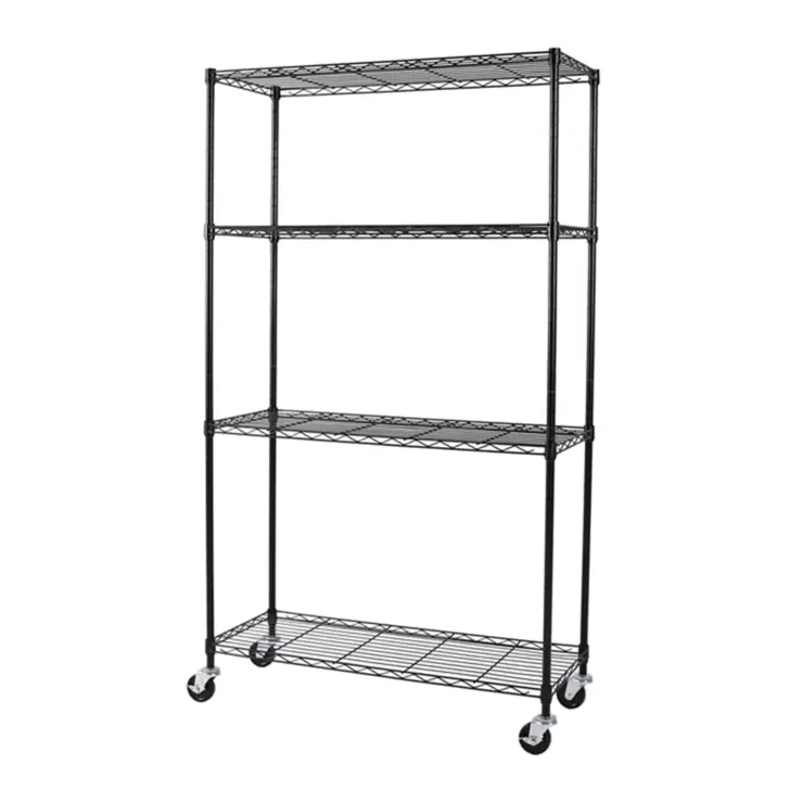 Trinity經過NSF認證的鐵架商品適合任何車庫、家庭或廚房使用。落地時每層承重量達113kg,適合擺放較小型物品。組裝時不需工具。本產品包含輪子。