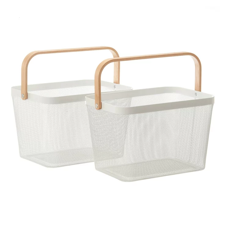 Rectangular Mesh Wire Storage Basket with Wood Handle 2-Piece Set White