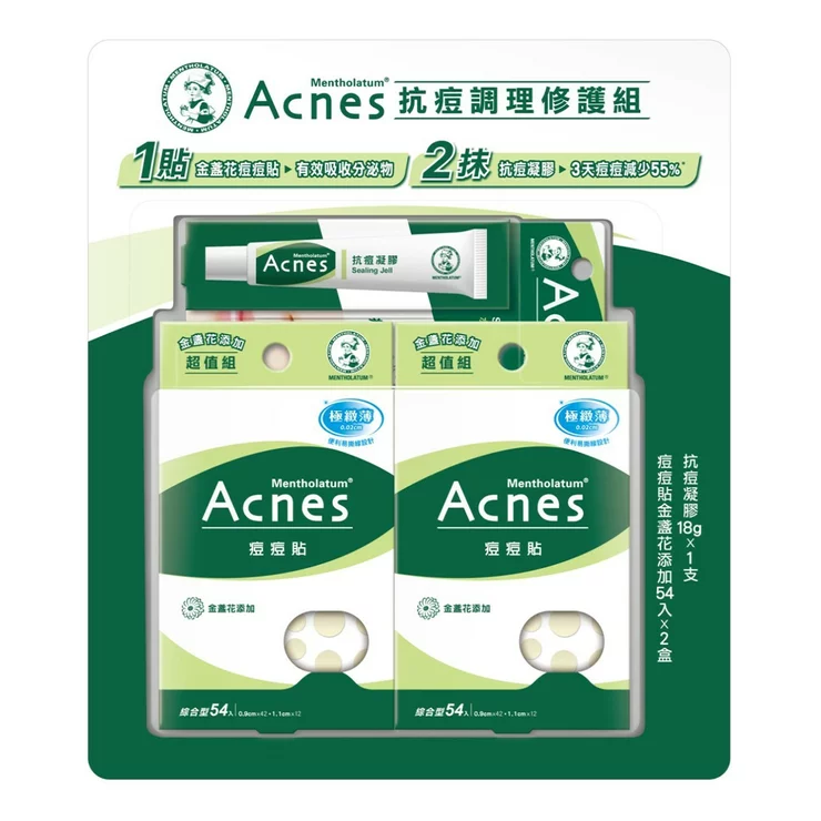 內容量/入數 : 曼秀雷敦痘痘貼(滅菌)54入 X 2盒 + 抗痘凝膠18公克 X 1入