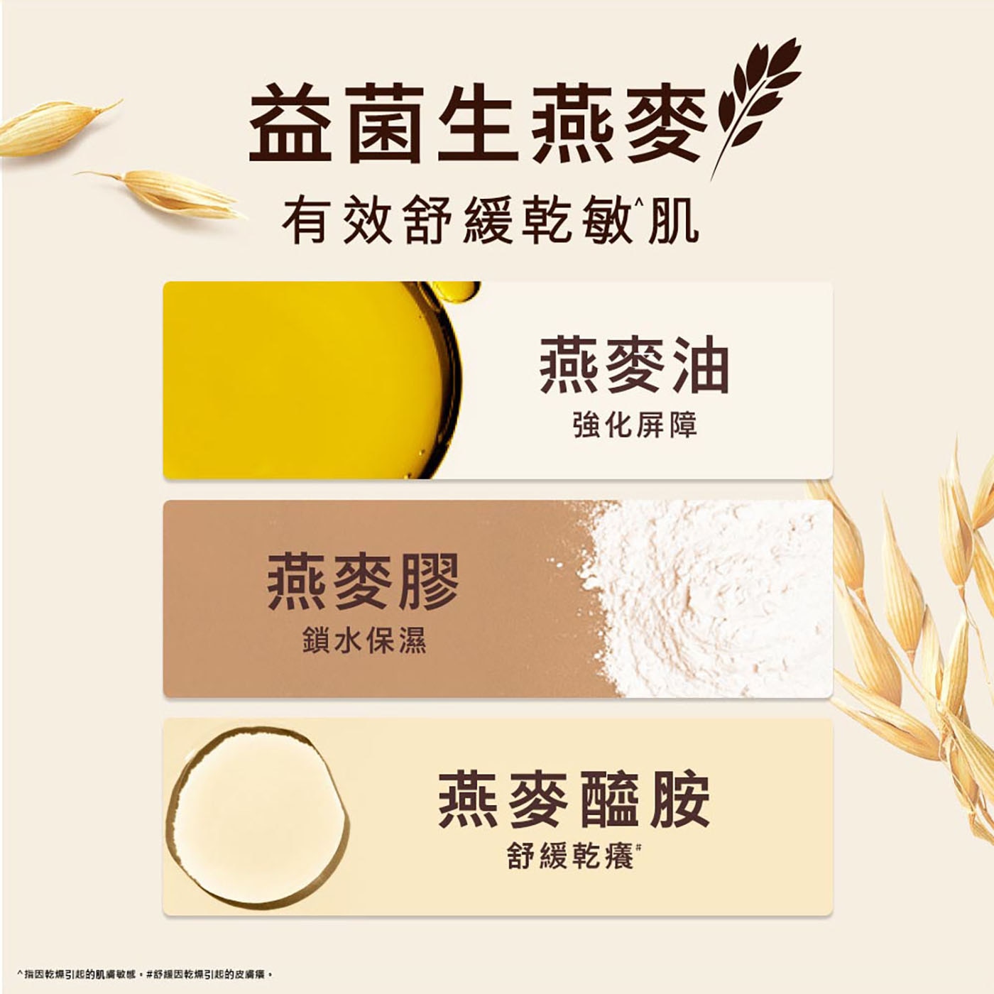 - 含益菌生燕麥及乳木果萃取,舒緩乾癢,長效保濕滋潤