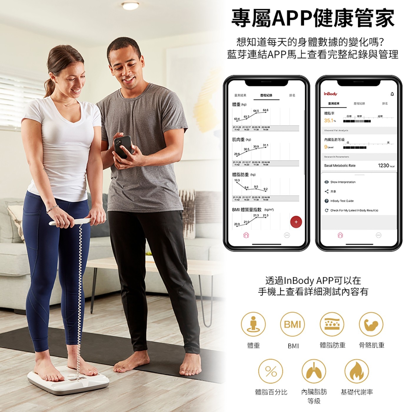 - 可測量七大數據: 體重、BMI、體脂肪重、骨骼肌重、體脂百分比、內臟脂肪等級、基礎代謝率
