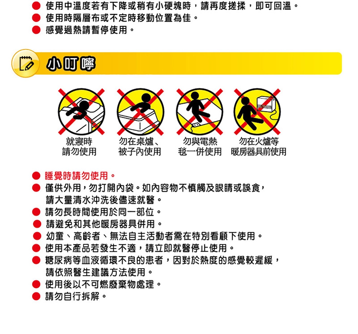 注意事項 | 1.睡覺時請勿使用。 2.僅供外用,勿打開內袋且讓成份接觸口及眼。 3.孩童、高齡者、臥病在床者需在特別看顧下使用。 4.避免長時間使用同一個部位,避免和其他暖器用品併用。 5.糖尿病等血液循環不良的患者,對於熱度的感覺較遲緩, 6.請依照醫生建議方法使用。 7.使用本產品若發生不適,請立即就醫停止使用。 8.使用後以不可燃之廢棄物處理。 9.請勿自行拆解 10.此產品無法食用,請勿放入口中,不慎誤食時,請漱口後前往醫院就診,萬一不慎進到眼睛裡,請不要搓揉,馬上以流動的水沖洗15分鐘以上,並前往醫院就診。 11.請務必詳閱包裝上的使用注意事項。 |