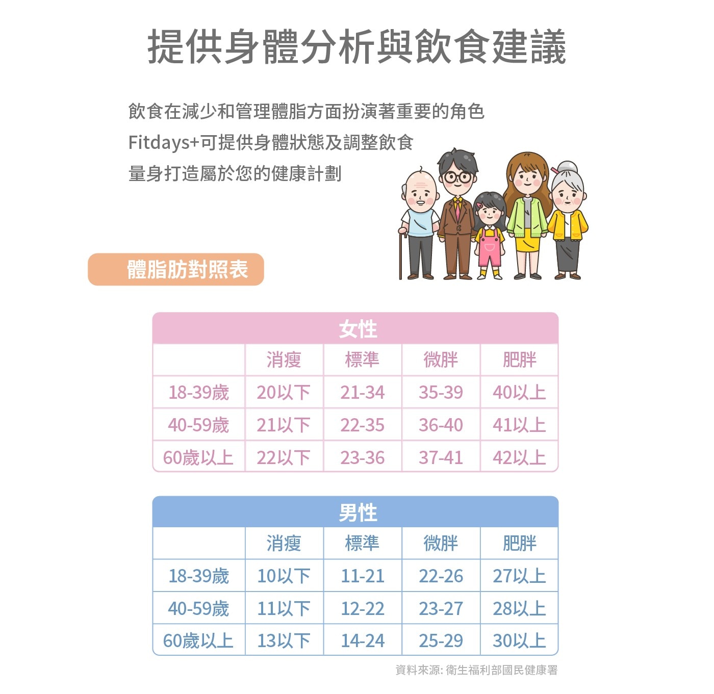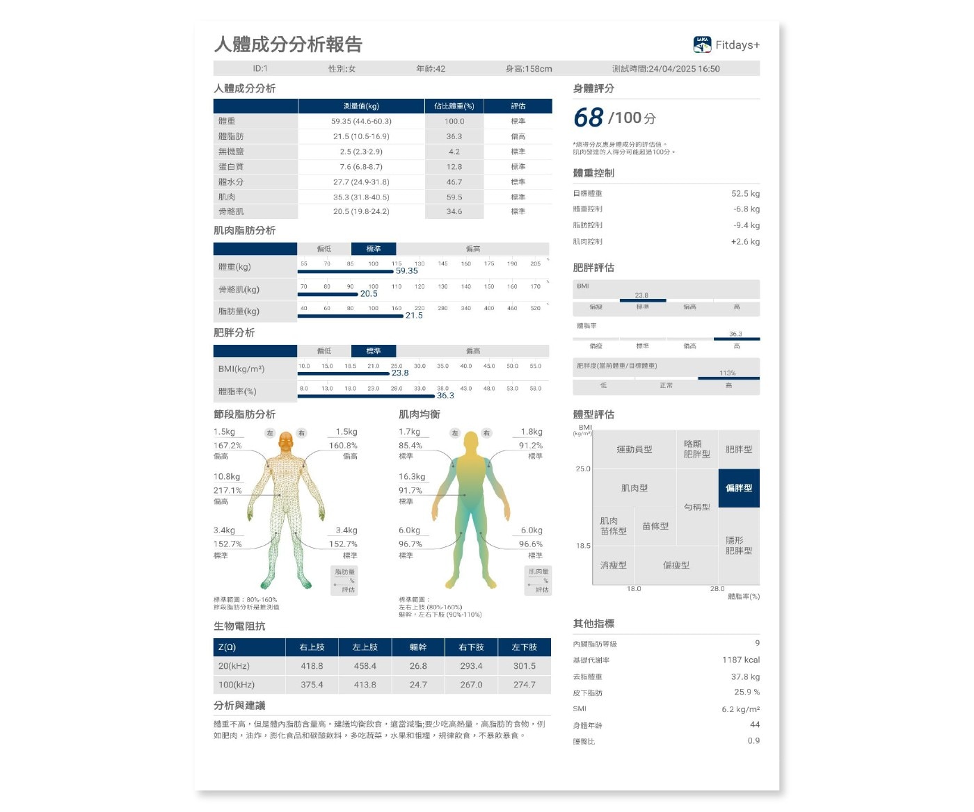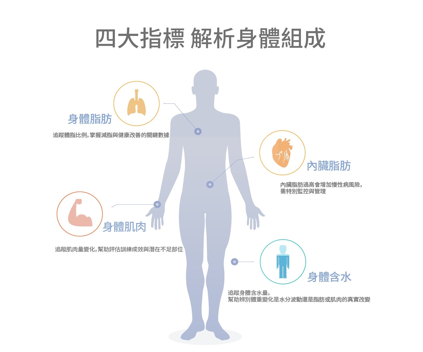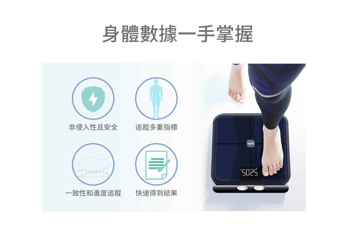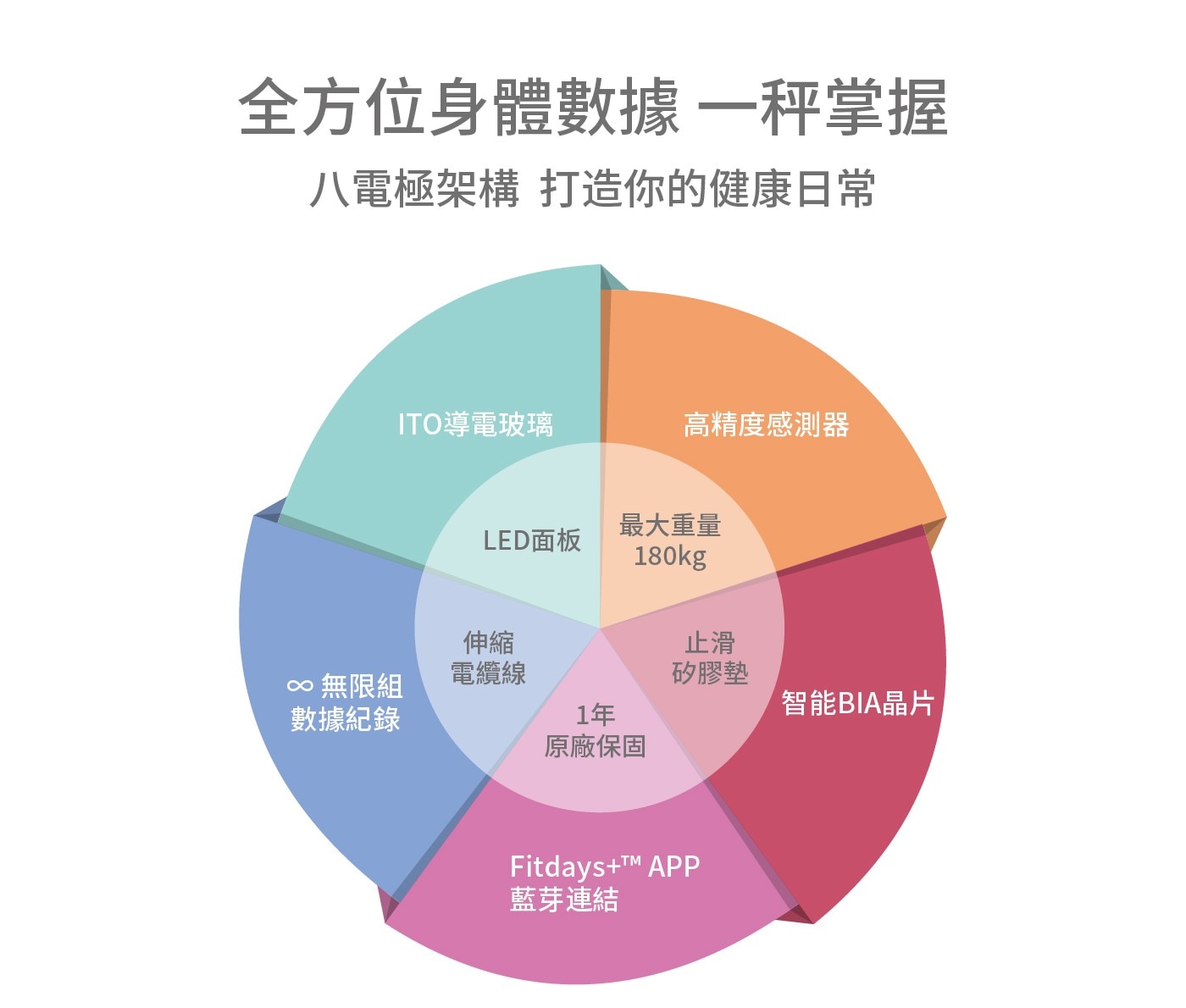- 包含七大數據: 體重、BMI、體脂肪重、骨骼肌重、體脂百分比、內臟脂肪等級、基礎代謝率