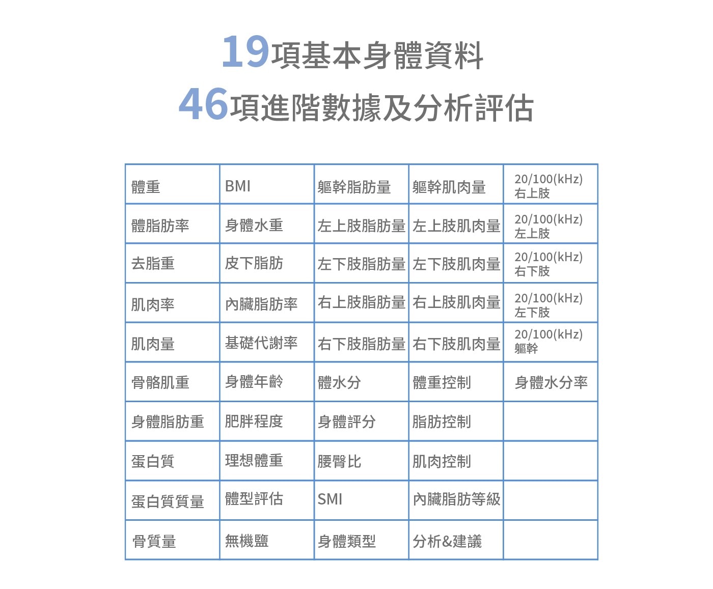 - 19項基本身體資料,46項進階數據分析評估