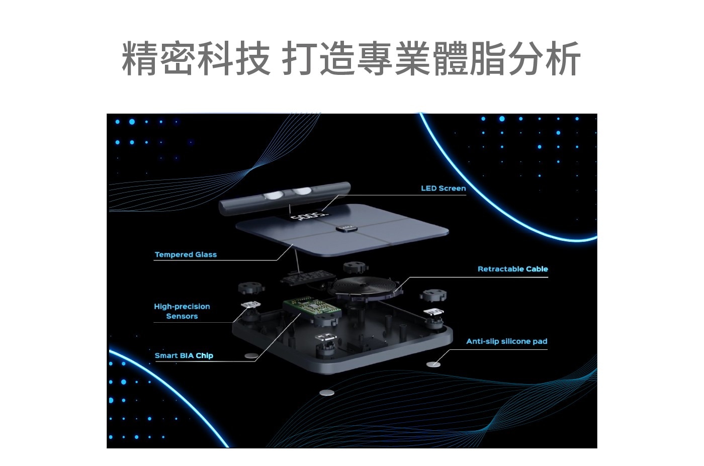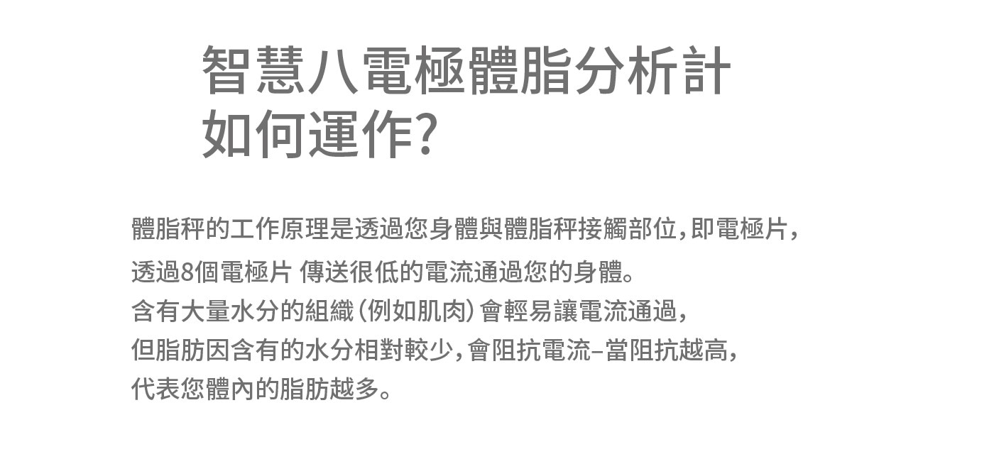 - ITO導電玻璃、高精度感測器、智能BIA晶片,以及8點接觸電擊,可以對任何體型進行準確測量