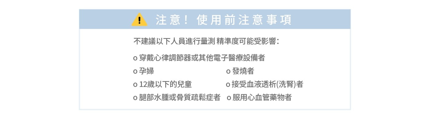 | 使用方式 | 1. 啟動FITDAYS+™ APP 2. 登入您的帳戶,選擇「設備」頁面,選擇使用的設備 3. 赤腳踩上秤面,注意將腳底正確的放置在電極上,並 握住測量手柄 4. 待測量完成後,您將可以在FITDAYS+™ APP中找到您 的身體數據 |