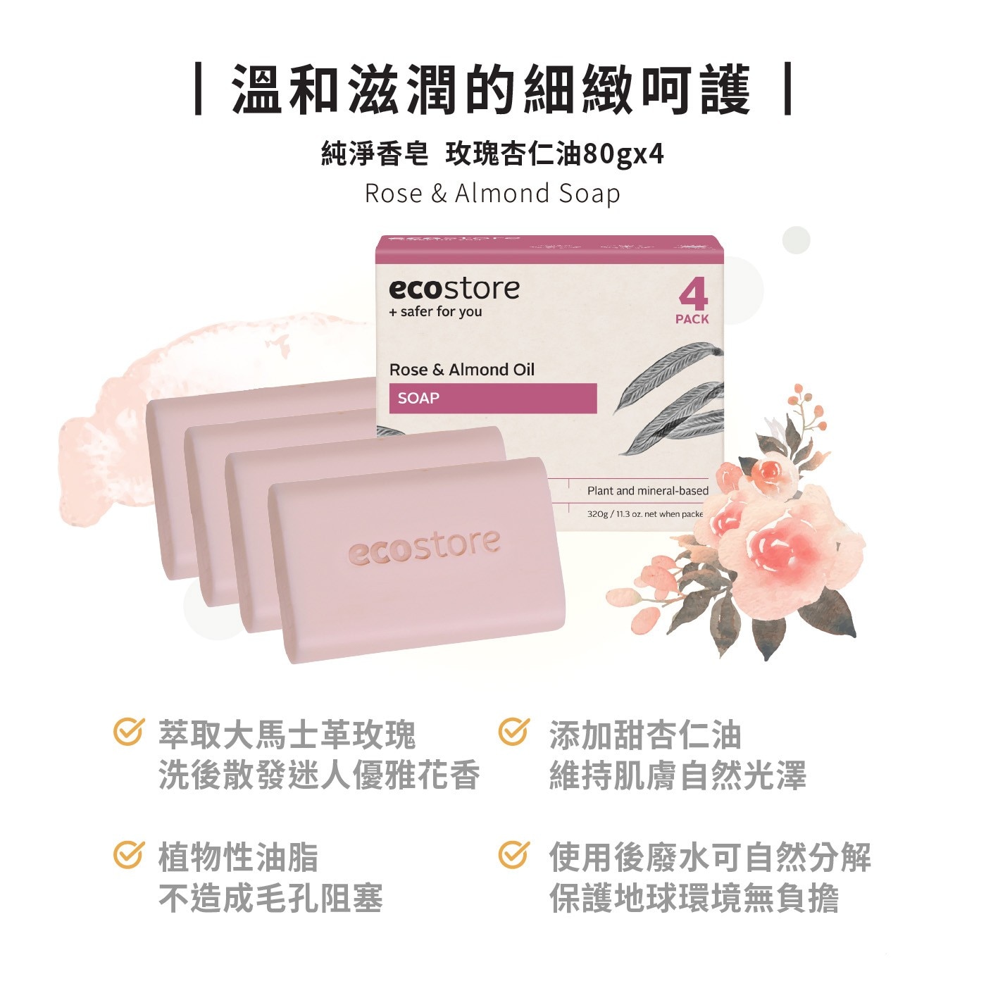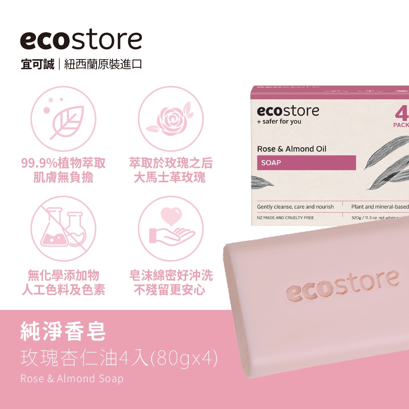 ecostore 純淨香皂 玫瑰杏仁油 80公克 X 4入 X 3組