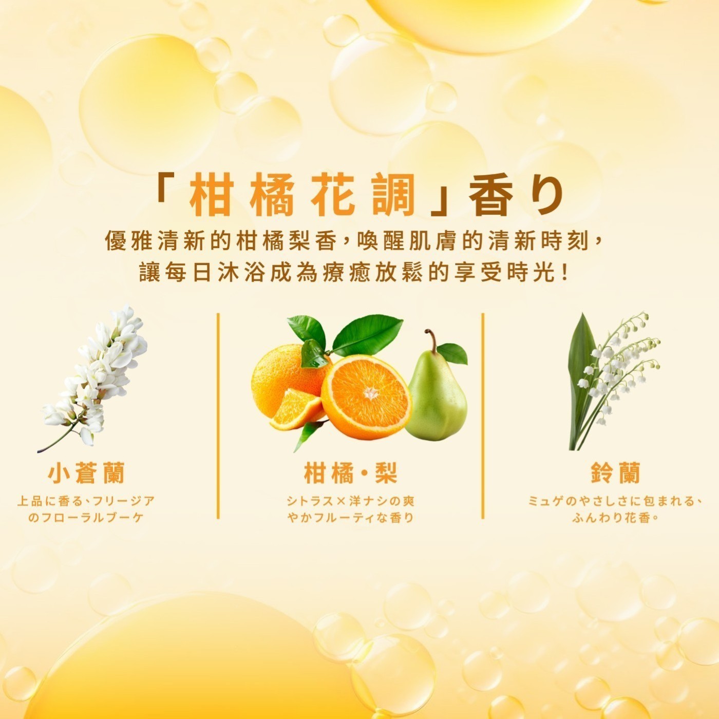 | 香味 | 清新柑橘梨香: 小蒼蘭 X 鈴蘭,療癒系香氣 |