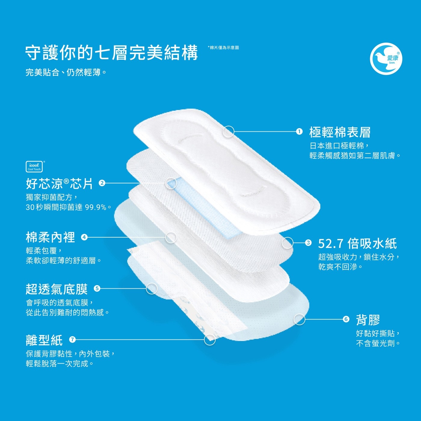 | 材質成分 | 主要材料:柔綿表層、好芯涼芯片、高分子吸水聚合物、透氣底膜 配方材料:薄荷精油、茶樹精油、深海礦物元素 |