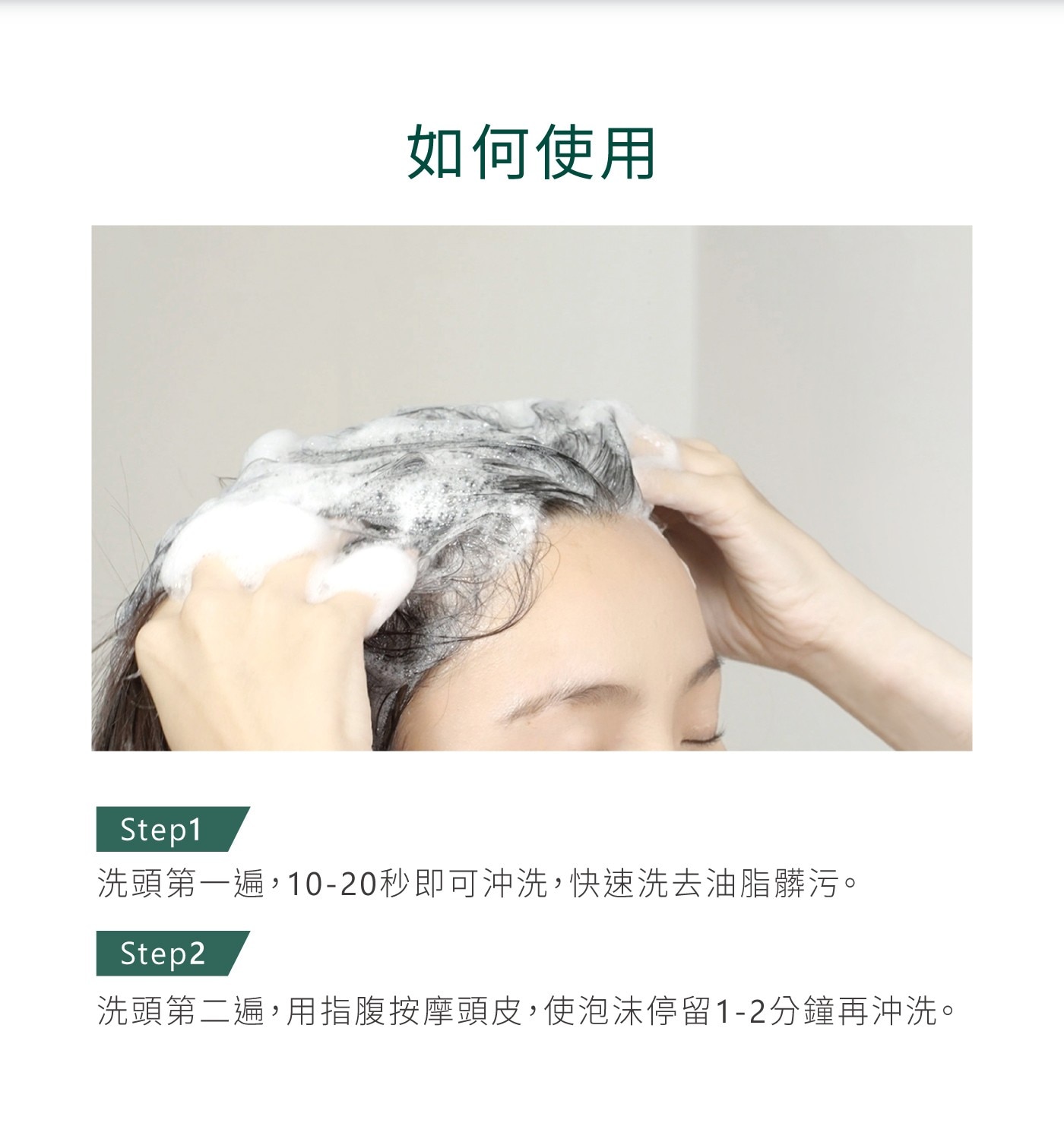 | 使用方式 | 第1次 / 使洗髮精快速包覆油污,泡沫較少,搓揉10-20秒後沖洗乾淨。 第2次 / 泡沫較多且細緻,用指腹按摩頭皮,搓揉1-2分鐘後即可沖洗。 |
