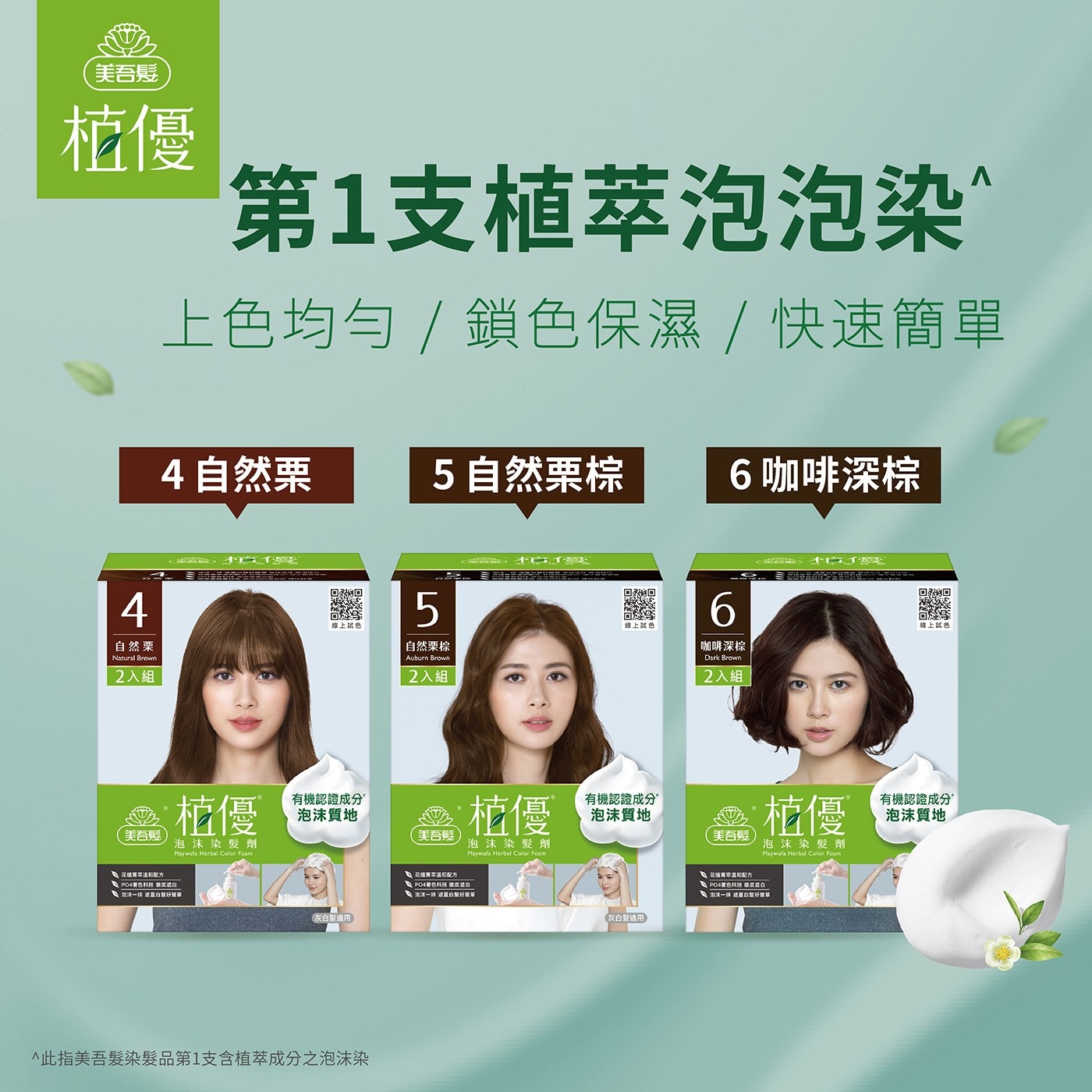 | 使用方式 | 使用前請詳閱盒內說明書。 1. 戴上手套,並綁上橡皮筋以防滑落。將第1劑全部倒入第2劑瓶內,並蓋上壓頭。 2. 以左右畫圓般輕柔搖晃瓶身20次以上,使內容物充分混合。 3. 將容器放置於穩固並平坦的表面,按壓壓頭3-4次,壓出適量泡沫於手心。 4. 請從頭頂(或白髮較多處)往髮尾、頭髮內側到外側方向,將大量泡沫均勻塗抹在乾髮上。 5. 以指腹伸入頭髮,輕輕將泡沫抹均在每根髮絲後,靜待20分鐘。 6. 用大量溫水沖洗頭皮及頭髮,直到水變乾淨為止,將頭髮擰乾。 7. 把植優凝萃護髮素均勻塗抹於濕髮上,輕輕按摩髮絲3分鐘後沖淨。將頭髮吹乾,即完成染髮。 |