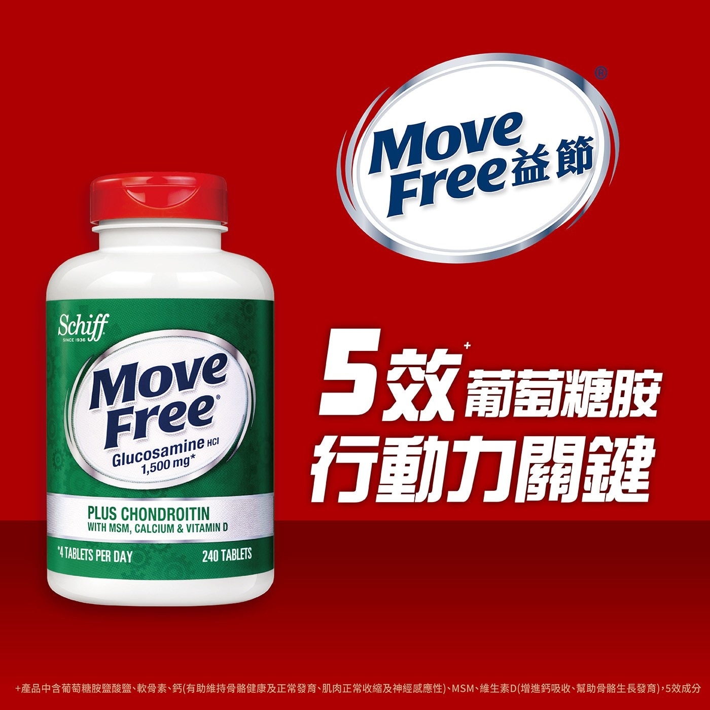 品名 : Schiff 益節葡萄糖胺+軟骨素+MSM+維生素D+鈣錠(食品) 240錠