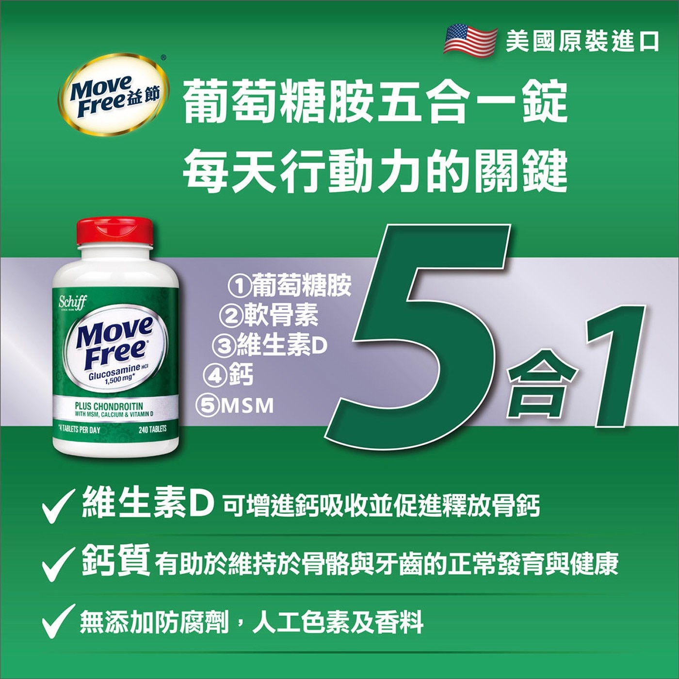 • 五合一配方:葡萄糖胺+軟骨素+MSM+維生素D+鈣