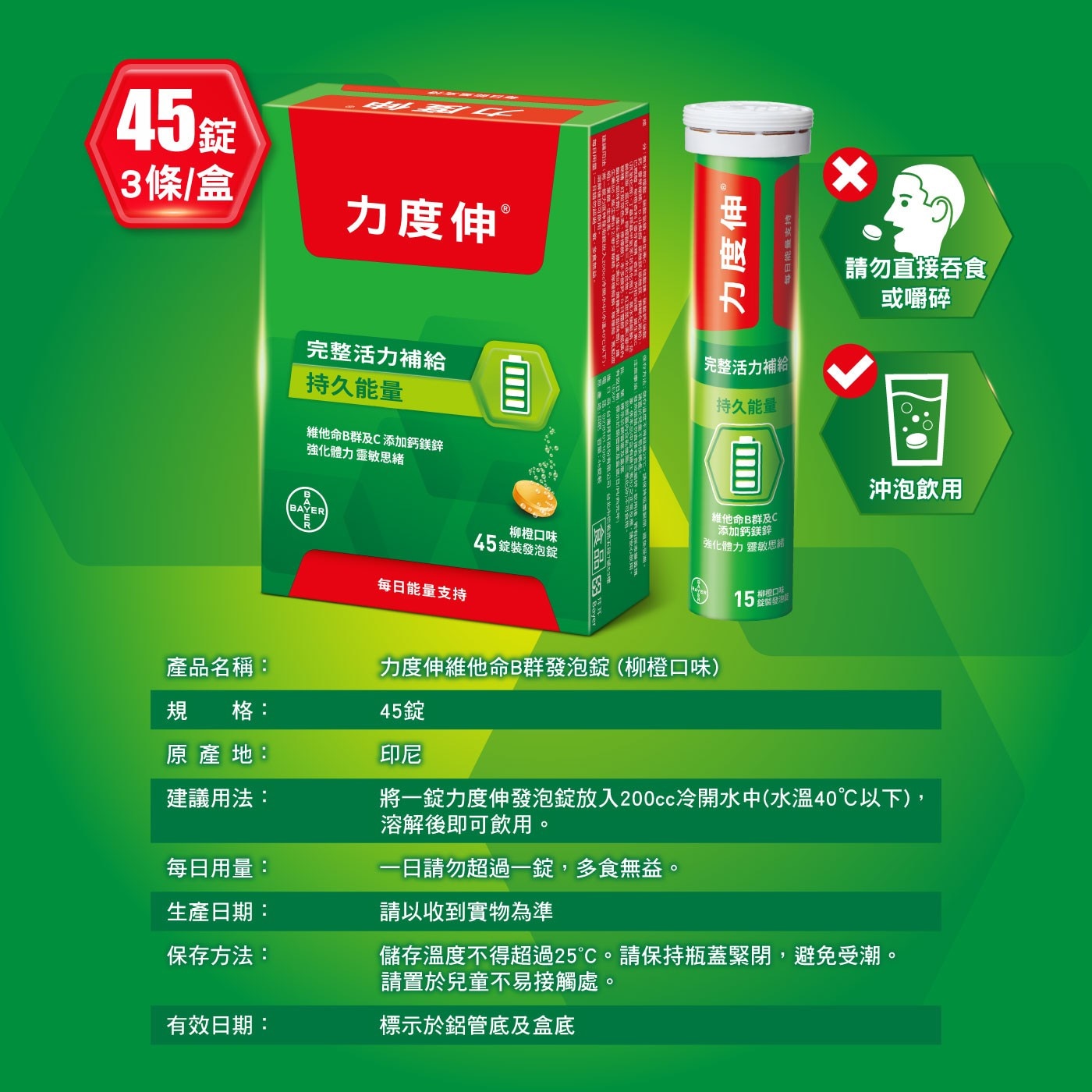 力度伸 維他命B群發泡錠 柳橙口味 45錠 (15錠 X 3條)