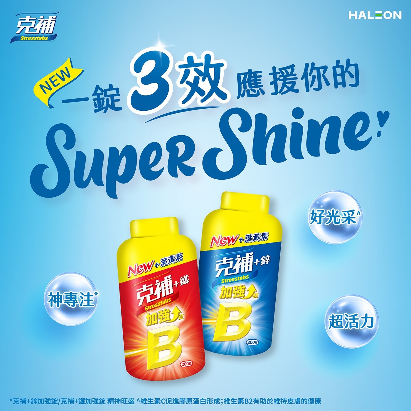 | 注意事項 | 1. 食用時可能會有尿液變黃的現象,是因為克補含有水溶性維生素B2成分,食用一定量後,會隨尿液自然排出,此為正常現象,無須掛慮。 2. 請倒至瓶蓋上再取用,避免水氣沾染其他錠劑,開啟食用後,請即拴緊。 3. 請置於陰涼乾燥及兒童無法取得之處。 4. 如同食用其他營養補充食品,孕婦及授乳婦在食用本產品前,請洽詢醫藥專業人員。 5. 本產品含有大豆卵磷脂。 |
