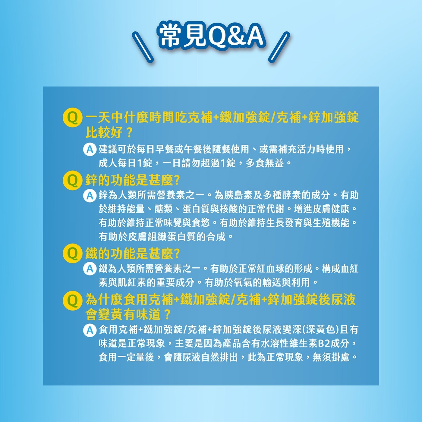 1. 食用時可能會有尿液變黃的現象,是因為克補含有水溶性維生素B2成分,食用一定量後,會隨尿液自然排出,此為正常現象,無須掛慮。