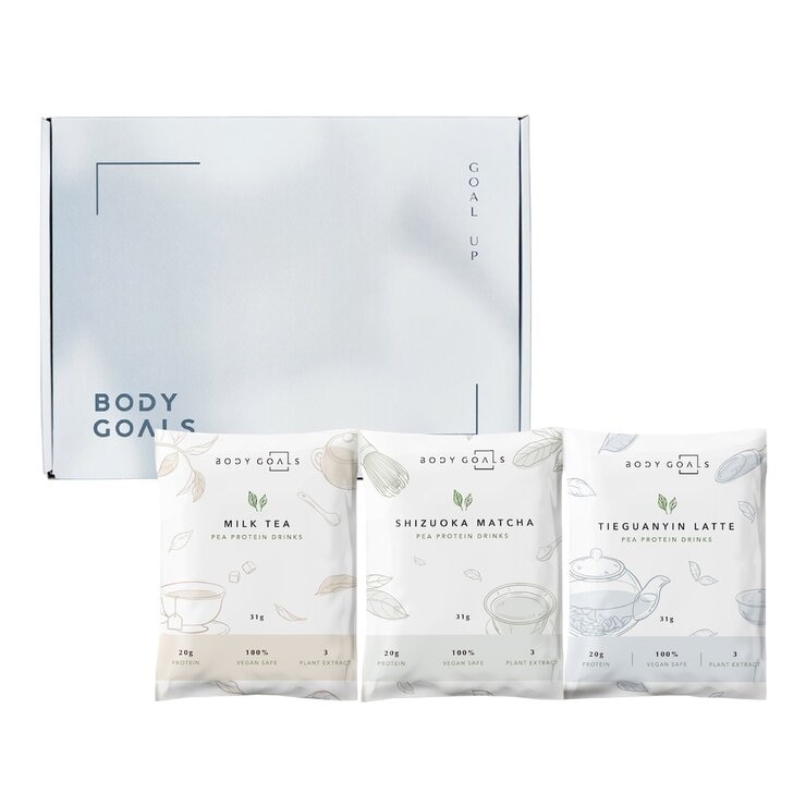 | 品名 | Body Goals 全素多效豌豆蛋白飲組合 31公克 X 30入 (馥郁奶茶/靜岡抹茶/觀音拿鐵) |