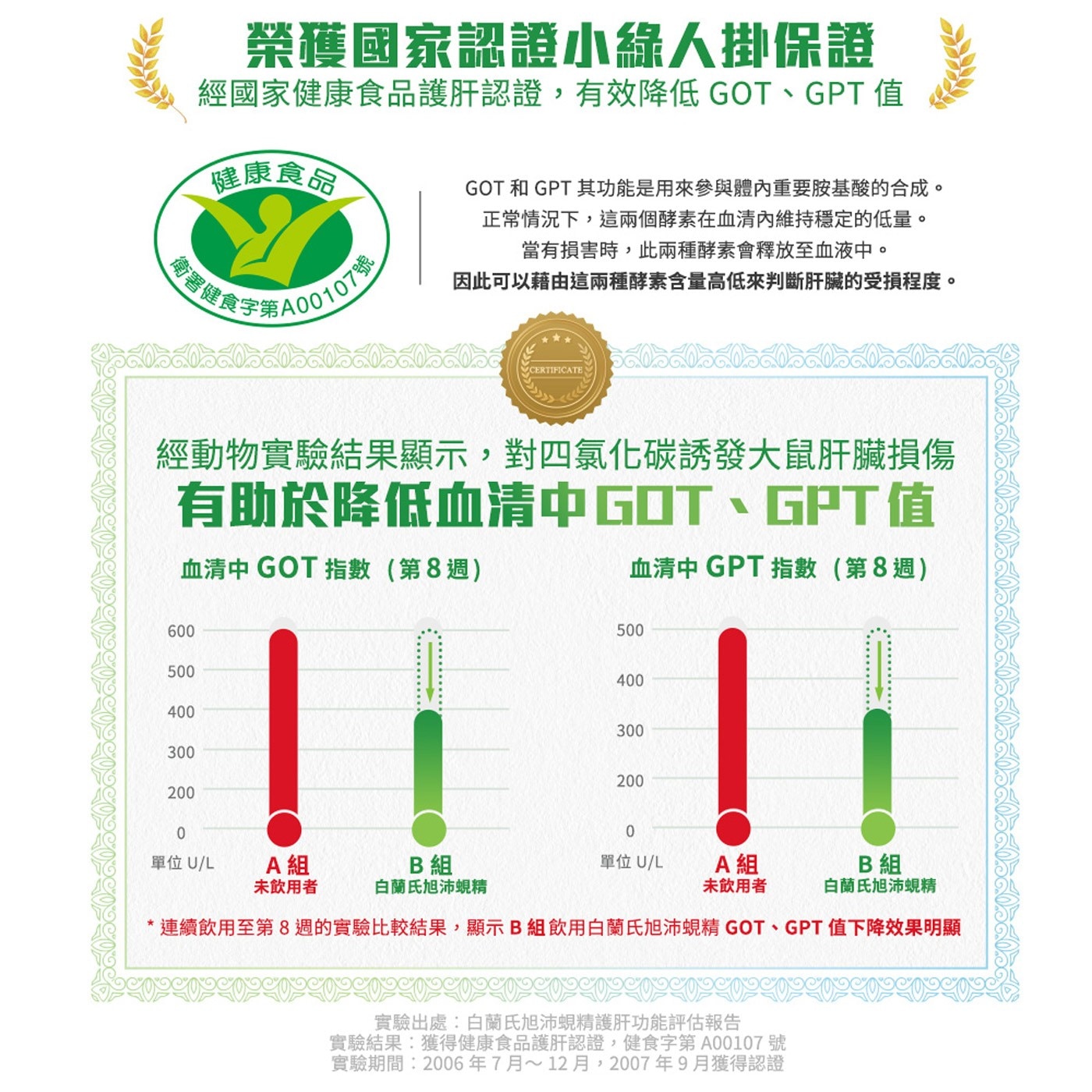 | 商品用途 | 經國家健康食品護肝認證, 有效降低GOT, GPT值 |