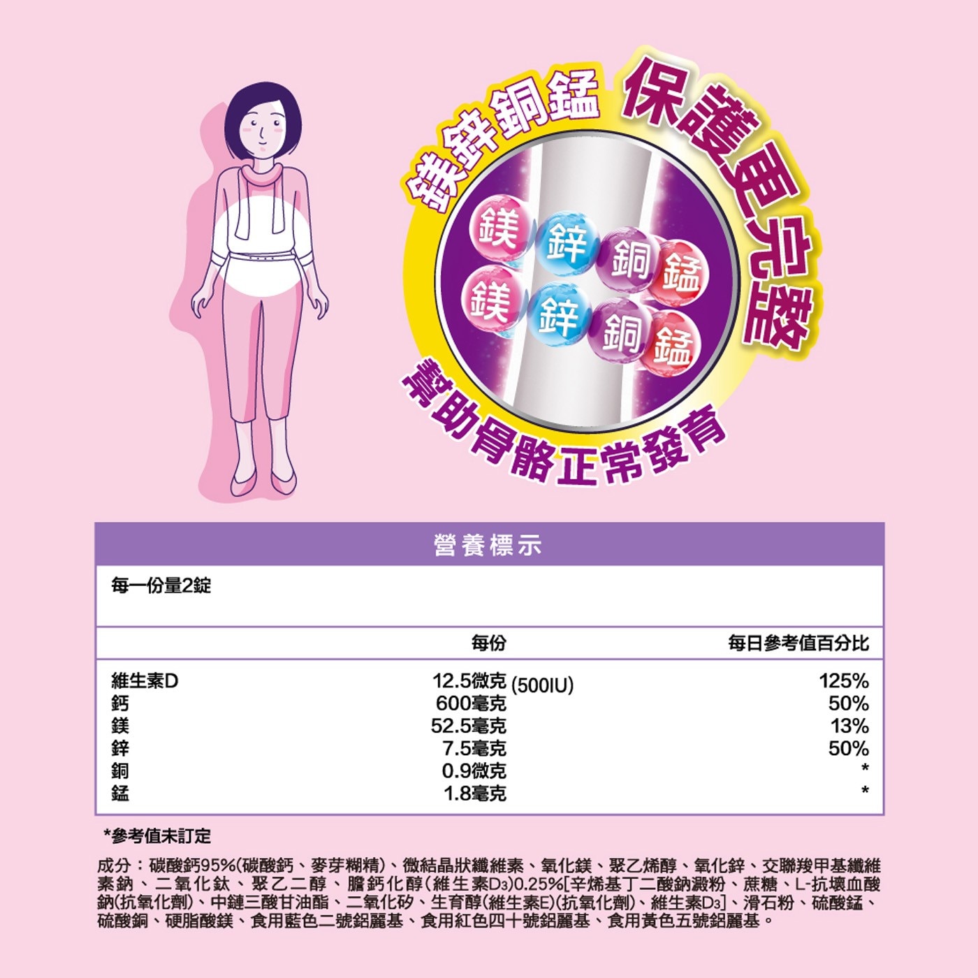 | 成分 | 碳酸鈣(碳酸鈣、麥芽糊精)、微結晶狀α-纖維素、氧化鎂、聚乙烯醇、氧化鋅、交聯羧甲基纖維素鈉、二氧化鈦、聚乙二醇、膽鈣化醇(維生素D3) [辛烯基丁二酸鈉澱粉、蔗糖、L-抗壞血酸鈉(抗氧化劑)、中鏈三酸甘油酯、二氧化矽、生育醇(維生素E)(抗氧化劑)、維生素D3]、滑石粉、硫酸錳、硫酸銅、硬脂酸鎂、食用藍色二號鋁麗基、食用紅色四十號鋁麗基、食用黃色五號鋁麗基。 |