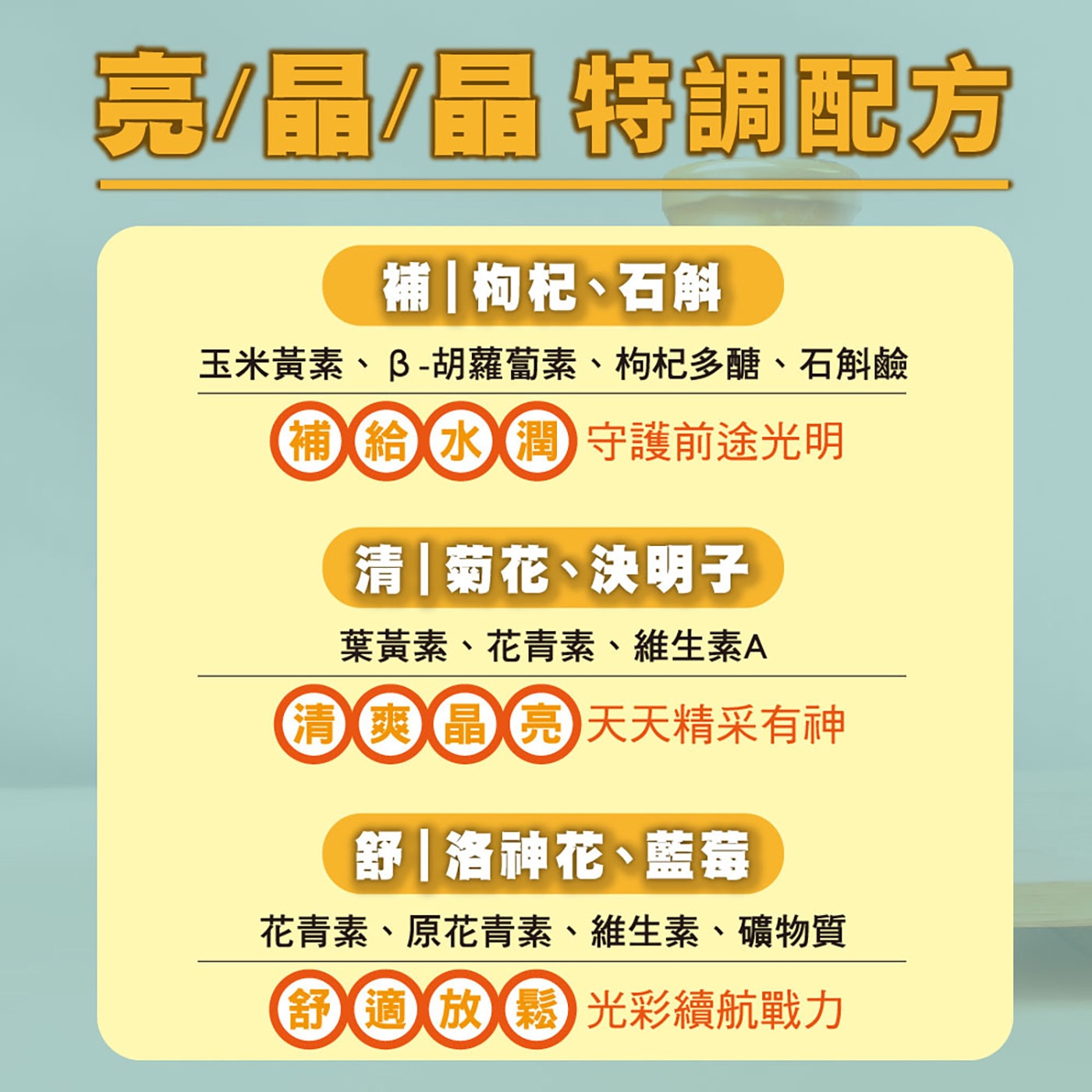 | 成分 | 水、糖、胡蘿蔔汁、土鳳梨汁、枸杞、甜菜根、洛神花、決明子、藍莓、檸檬酸、菊花、檸檬酸鈉、甜菊葉、維生素C(抗氧化劑)、石斛 |