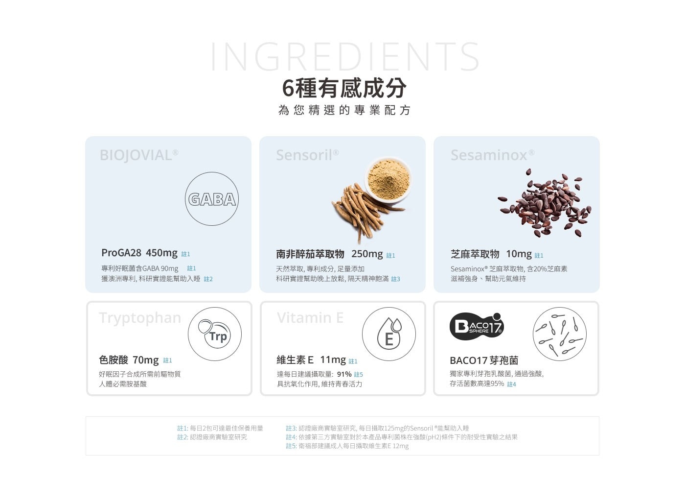成分 | 乳糖,蔗糖,可可粉,ProGA28短乳酸桿菌發酵物(具20% GABA) (麥芽糊精,短乳酸桿菌Lactobacillus brevis發酵物),專利南非醉茄萃取物 (南非醉茄萃取物,麥芽糊精,二氧化矽),阿拉伯膠, 香料[乳糖,香料,二氧化矽,焦糖色素,玉米糊精,棕櫚油,辛烯基丁二酸鈉澱粉, 生育醇(抗氧化劑),奶粉,婀娜多,薑黃色素,麥芽糊精],二氧化矽,L-色胺酸, 維生素E(維生素E,葡萄糖漿,辛烯基丁二酸鈉澱粉,二氧化矽), 芝麻萃取物(微結晶狀α-纖維素,芝麻萃取物),BACOSPHERE17®芽孢乳酸菌Bacillus coagulans BACO17 |