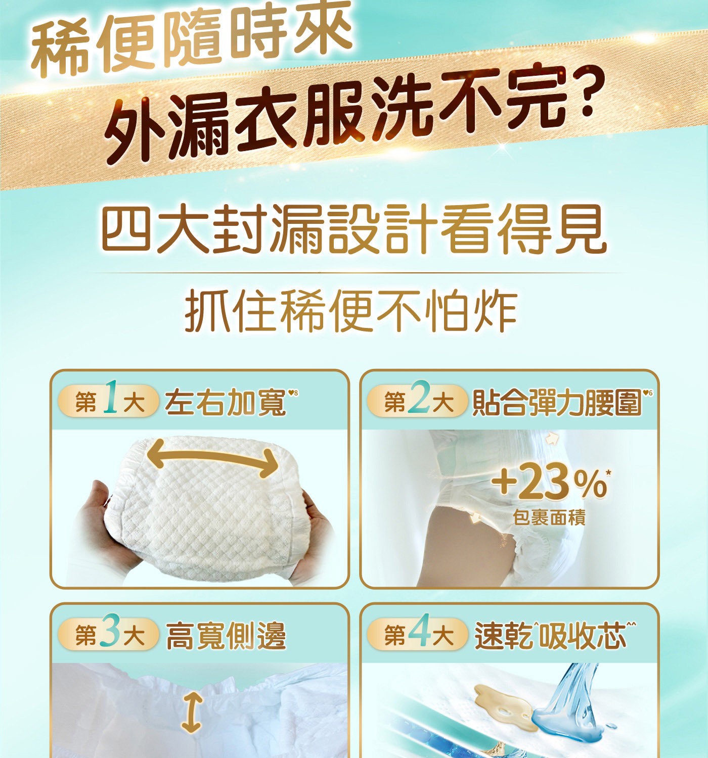 | 注意事項 | 避免紙尿褲的膠帶或膠貼直接與寶寶的皮膚接觸。為了避免窒息及勒住嬰兒脖子的意外,請將包裝塑料袋及其提手(如適用)放在遠離嬰兒和兒童的地方。請注意本產品的保存位置,以防寶寶誤食或窒息。使用後請馬上丟棄。 |