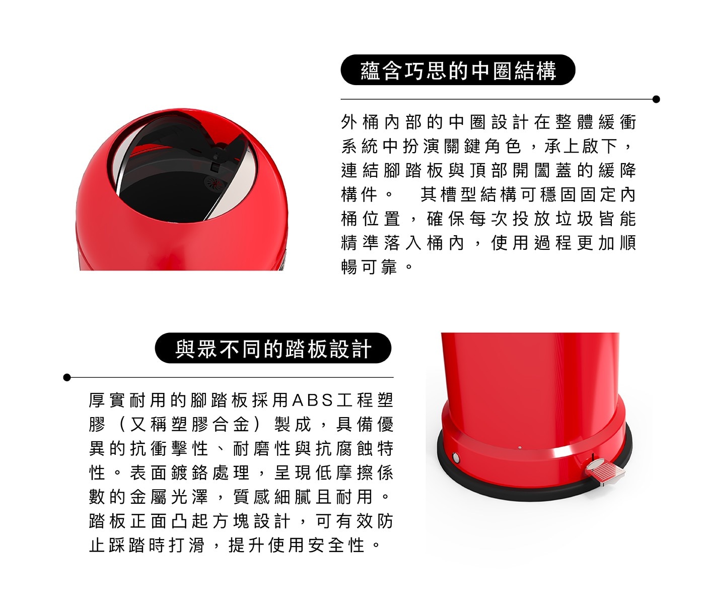 | 使用方式 | 輕踩踏板即可開蓋投入垃圾,移開腳後上蓋靜音緩降關閉;更換垃圾袋時,雙手提起外桶,取出內桶更換後再覆回即可。 |