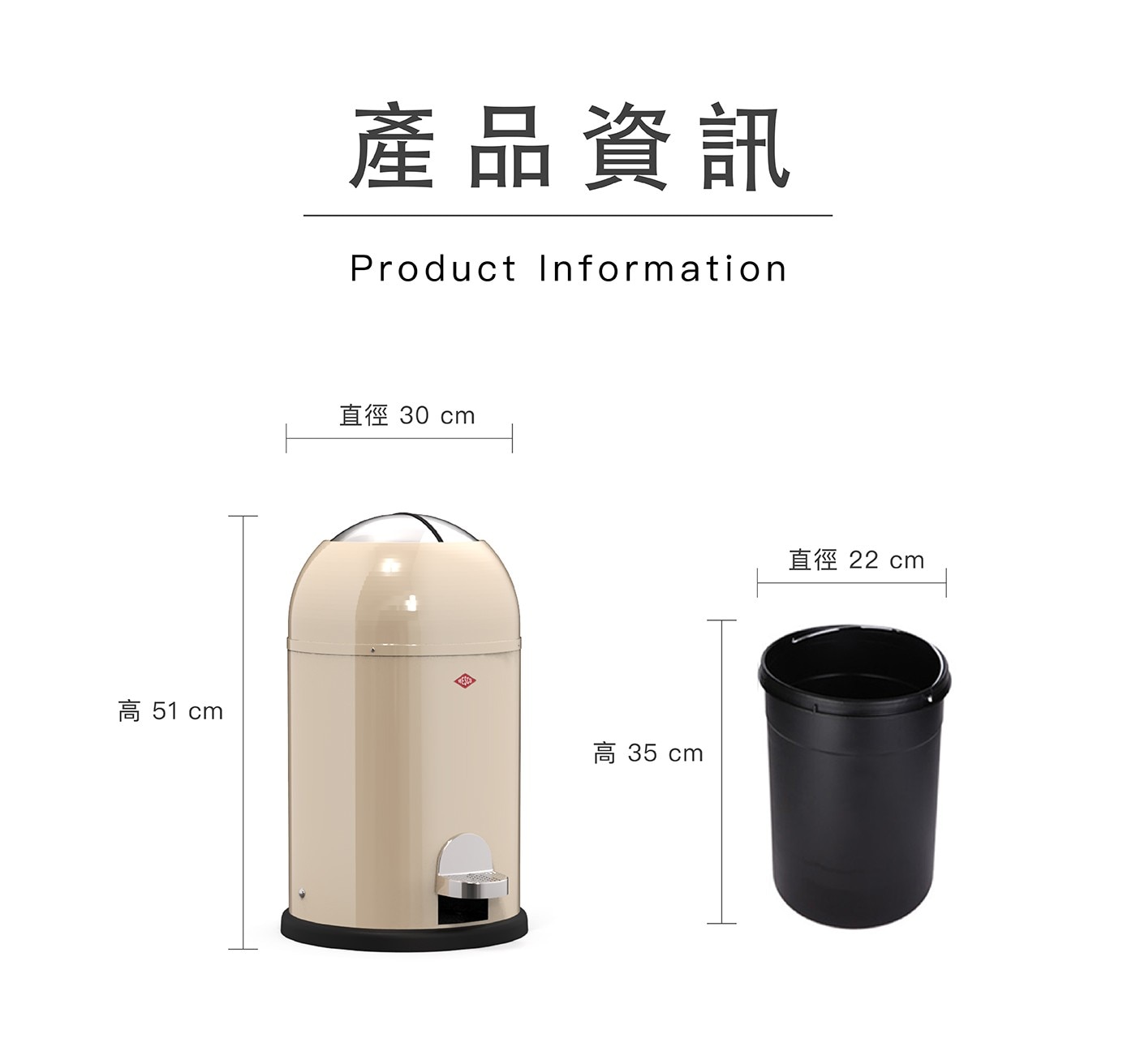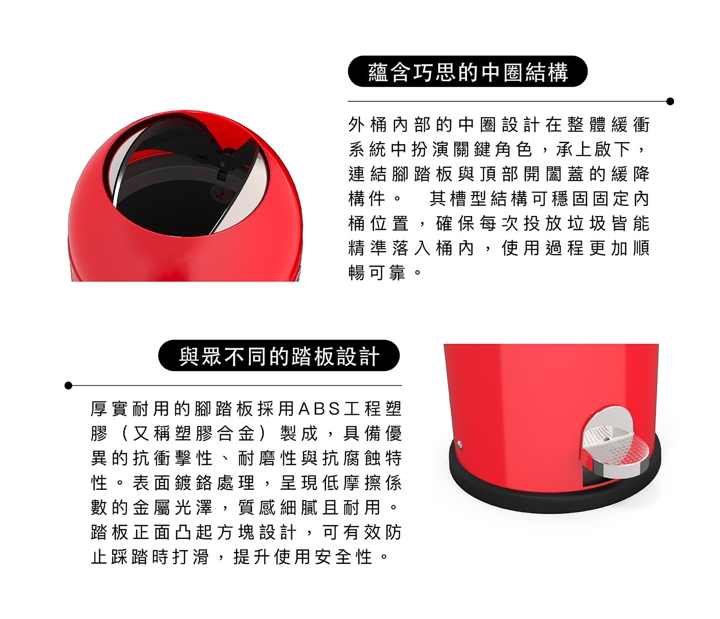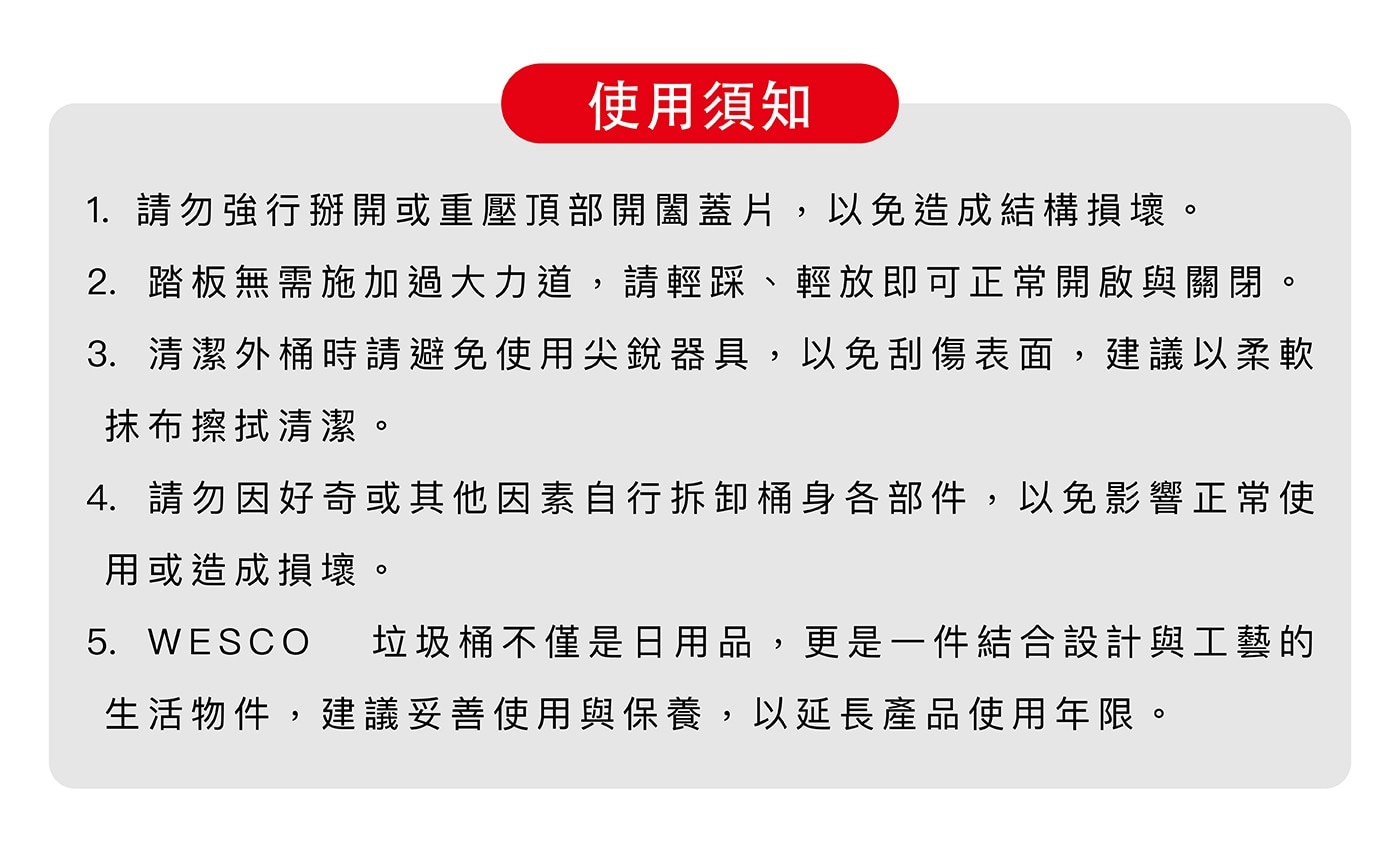 | 使用方式 | 輕踩踏板即可開蓋投入垃圾,移開腳後上蓋靜音緩降關閉;更換垃圾袋時,雙手提起外桶,取出內桶更換後再覆回即可。 |