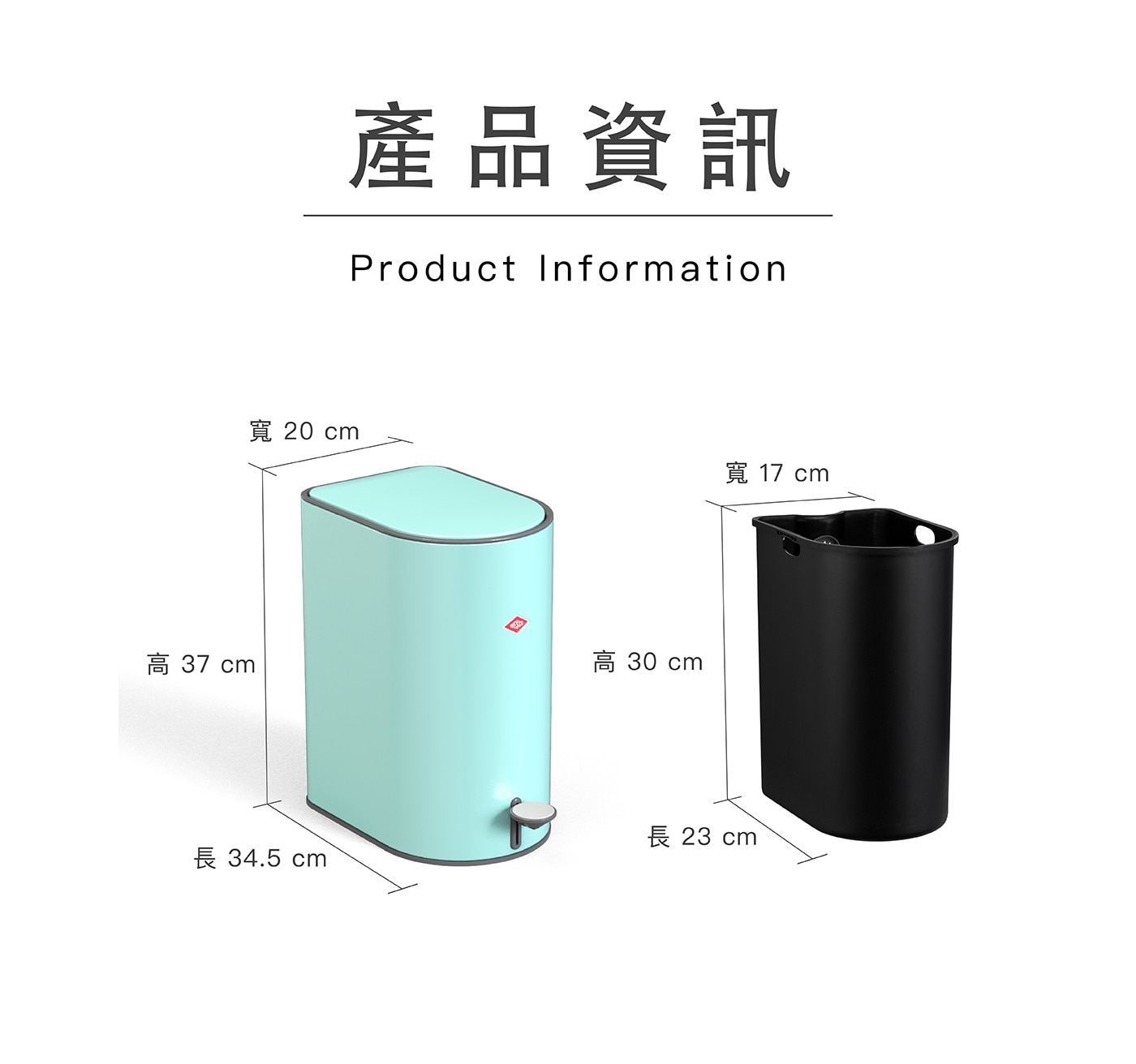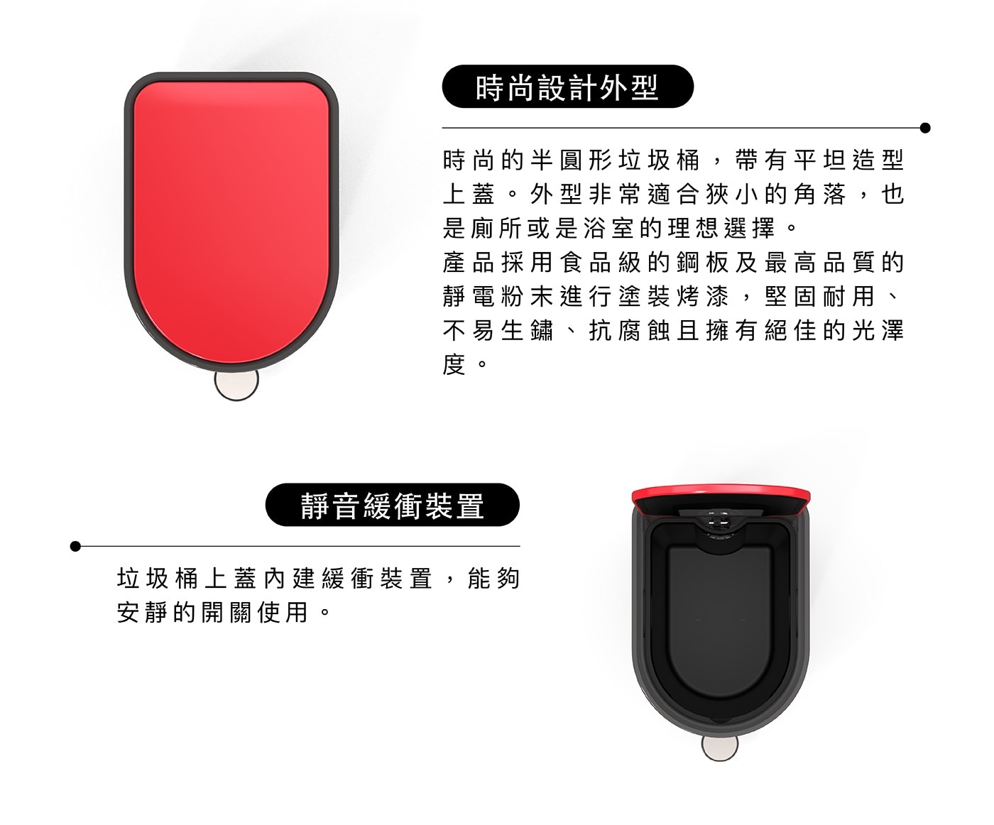 - 桶身使用最高品質靜電粉末烤漆與食品級不鏽鋼板材質製成,質地細緻、耐用不易生鏽,兼具美感與實用性。上蓋內建靜音緩衝裝置,透過穩定踏板即可輕鬆開啟,關閉時平穩安靜,避免噪音干擾日常生活。