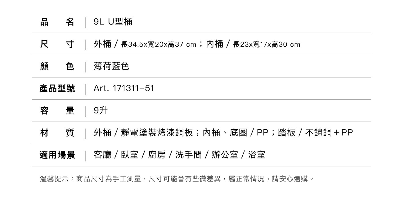 | 品名 | WESCO 威士克 U型垃圾桶 9公升 薄荷綠 |