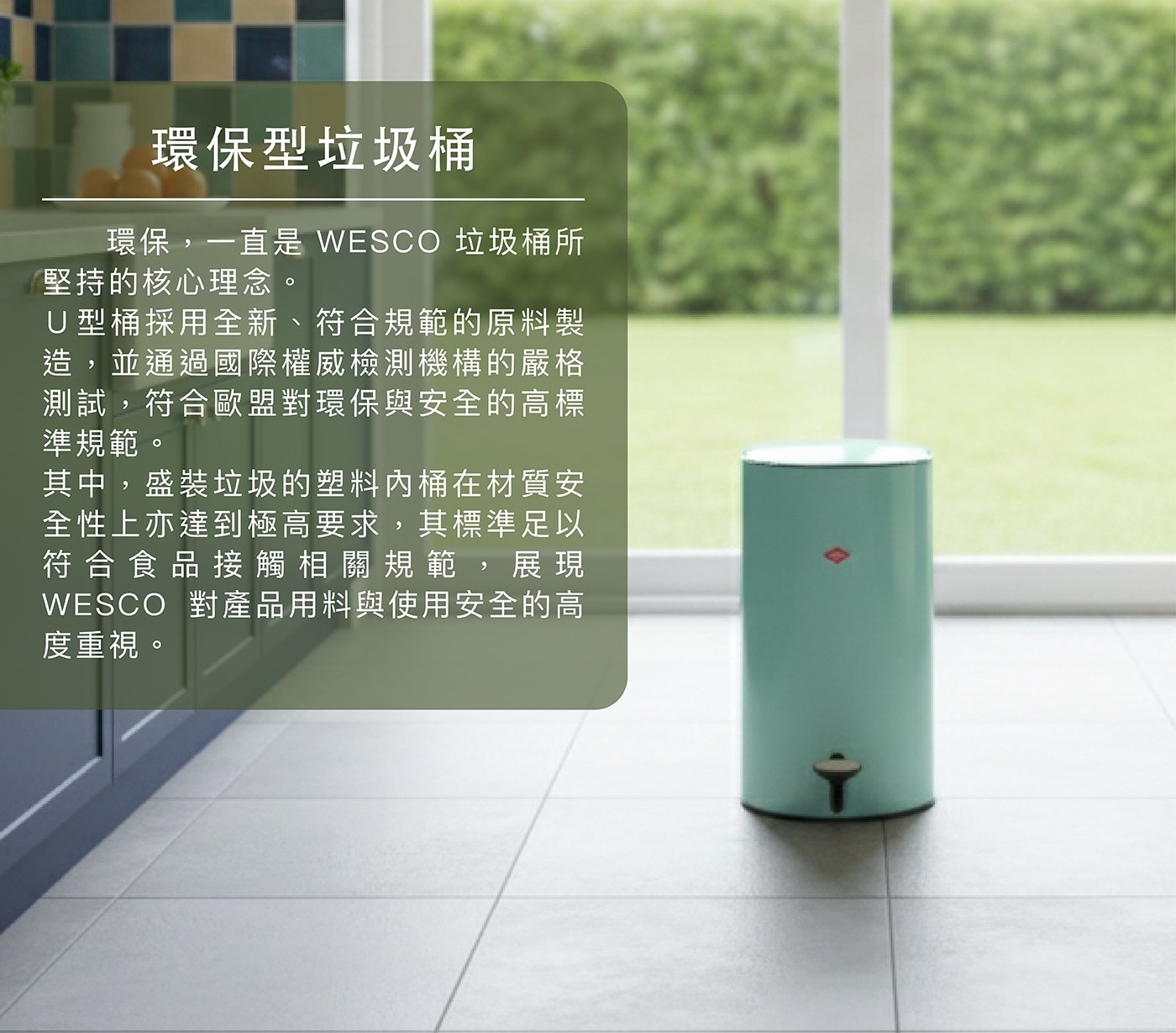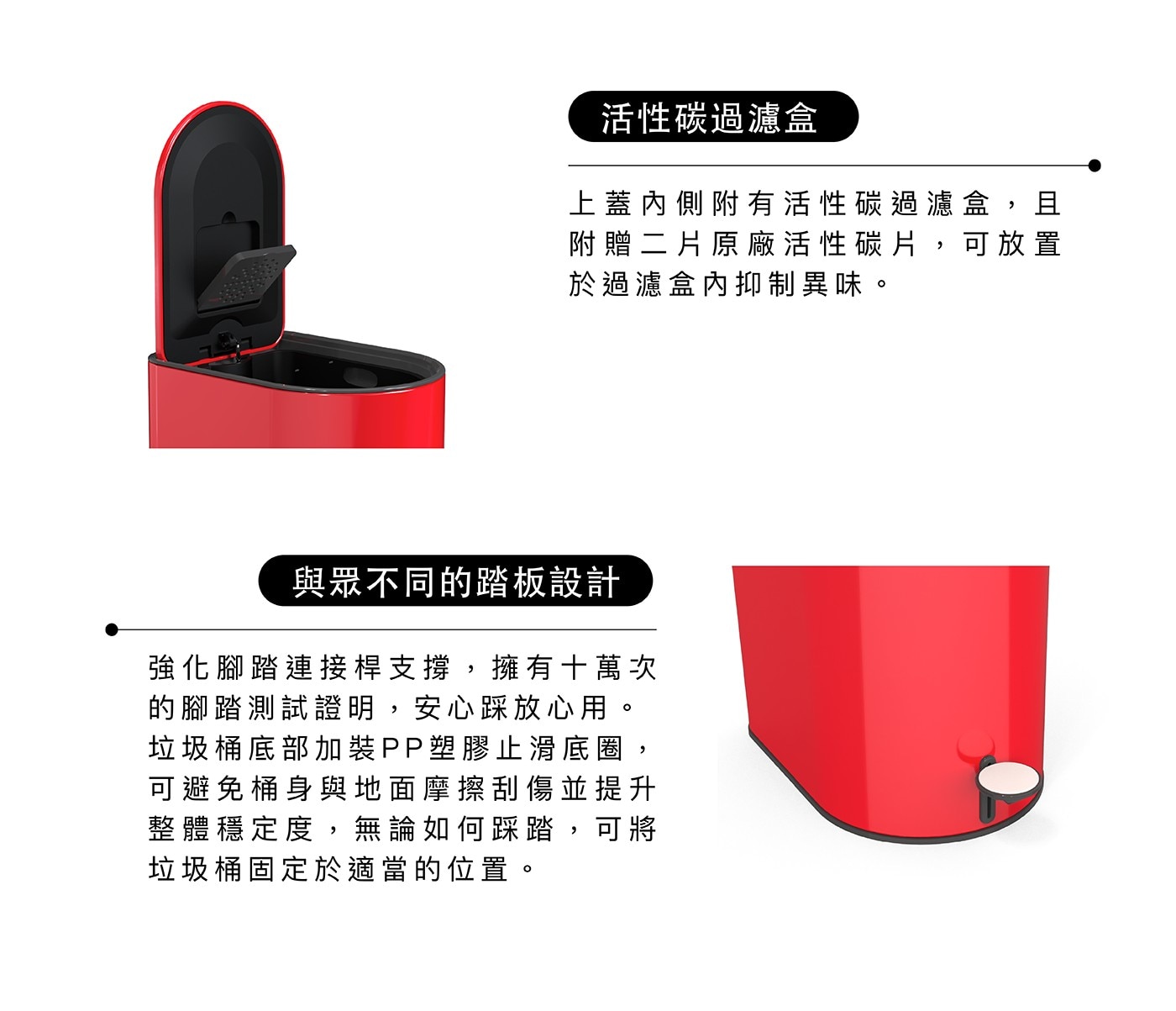 - 桶身使用最高品質靜電粉末烤漆與食品級不鏽鋼板材質製成,質地細緻、耐用不易生鏽,兼具美感與實用性。上蓋內建靜音緩衝裝置,透過穩定踏板即可輕鬆開啟,關閉時平穩安靜,避免噪音干擾日常生活。