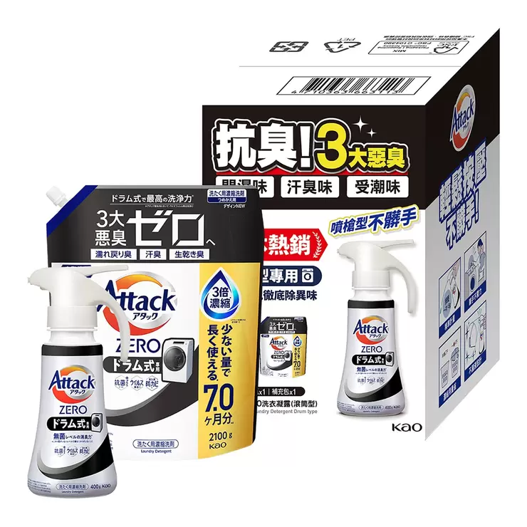 | 品名 | Attack ZERO 超濃縮噴槍型洗衣凝露 滾筒型專用 400公克 + 補充包 2100公克 |