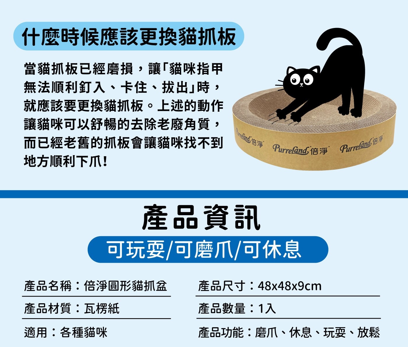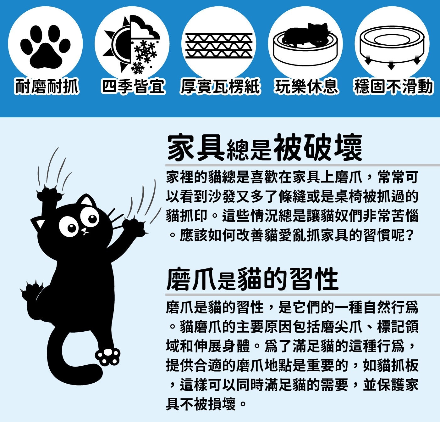 使用方式 | 1. 引導貓咪靠近貓抓板 2. 給予貓咪鼓勵和獎勵,當牠使用貓抓板時,例如:給予獎勵性食物或語言讚揚 3. 適時與貓咪互動並引導其使用貓抓板,特別是在貓咪想抓家具或其他物品時 |