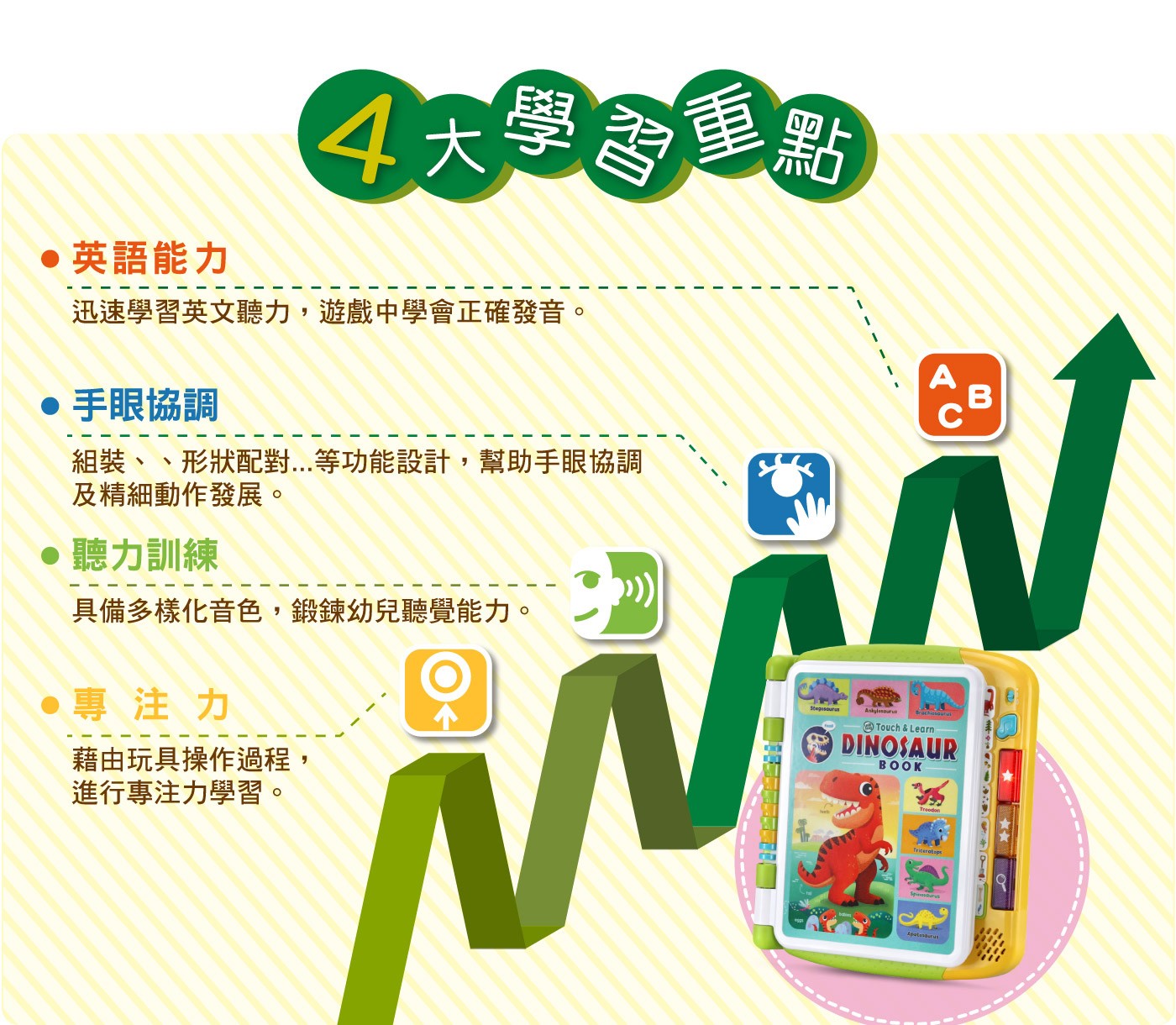 - LeapFrog 學習專家 Mollie Levin文學碩士說:恐龍世界點讀書每一頁充滿刺激又冒險的故事和英文發音,不僅激發了孩子們對恐龍的好奇心,還有助於他們的語言發展、聽力技能和學習能力。