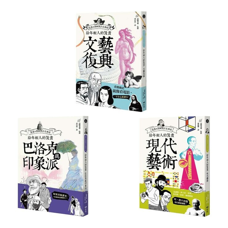 | 品名 | 【漫畫 & 圖解西洋美術史套書】(三冊):《給年輕人的漫畫文藝復興》+《給年輕人的漫畫巴洛克與印象派》+《給年輕人的漫畫現代藝術》(三版) |