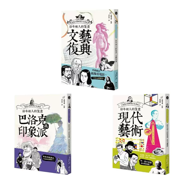 本套書組合:《給年輕人的漫畫文藝復興:漫畫&圖解西洋美術史I》、《給年輕人的漫畫巴洛克與印象派:漫畫&圖解西洋美術史Ⅱ》、《給年輕人的漫畫現代藝術:漫畫&圖解西洋美術史Ⅲ》共三冊