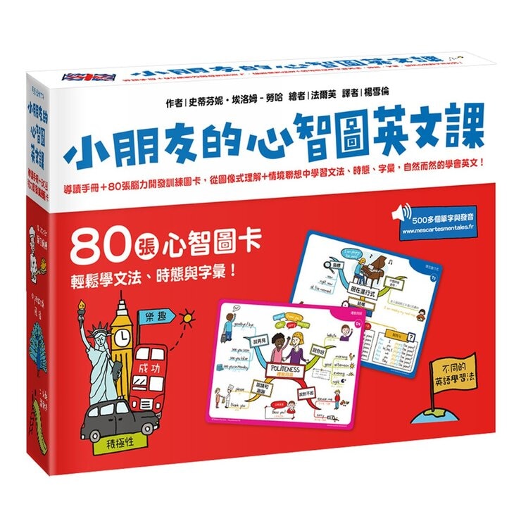 | 品名 | 小朋友的心智圖英文課:導讀手冊+80張腦力開發訓練圖卡,從圖像式理解+情境聯想中學習文法、時態、字彙,自然而然的學會英文! |