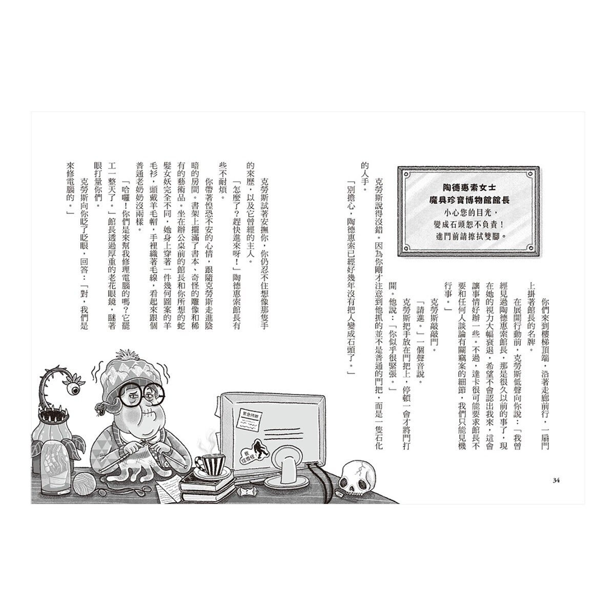 魔具珍寶博物館為了不被購物中心取代,借來「時間海綿」舉辦特展。據說只要擠壓海綿,時間就會瞬間暫停,僅持有者能自由移動。然而,這件珍貴的展品卻在風光的夜間記者會後消失無蹤!可能的竊賊有——深陷財務危機的蛇髮女妖館長、急於立功的精靈女警、苦於尋找人才的牛頭怪警長、毫無新聞倫理的報喪女妖記者、嚴重拖稿的矮精靈教授、患有失憶症的人魚快遞……
