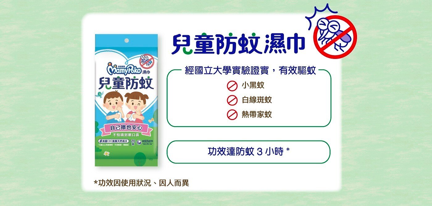 | 注意事項 | 請避免接觸傷口、眼睛、口腔周圍 擦拭時可能會感到些許刺激感,若有肌膚異常或不適,請立即停止使用,若仍感不適,請持本產品盡速就醫 易過敏者請先於肌膚局部範圍擦拭,若無過敏症狀再擴大使用範圍懷孕、哺乳女性或有特殊肌膚問題者,建議諮詢醫師後使用 請置於嬰幼兒不易拿取的地方 本商品無法預防登革熱等疾病;不適用於2歲以下嬰幼兒 本產品不溶於水請勿丟入馬桶,請依所在地規定進行廢棄物處理(分為可燃/不可燃) |